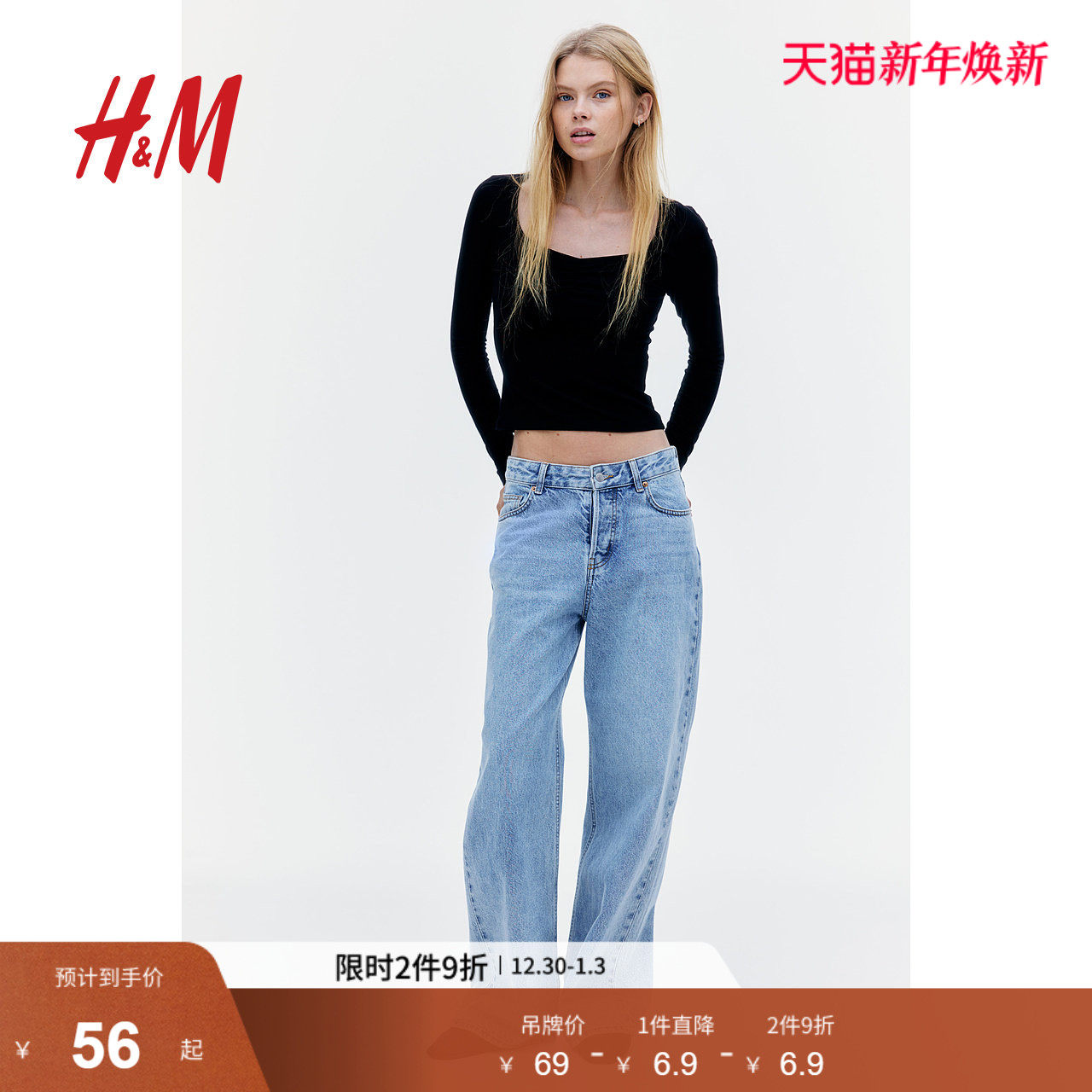 HM女装T恤冬季时尚休闲简约桃心领长袖修身上衣1265784