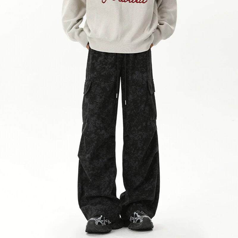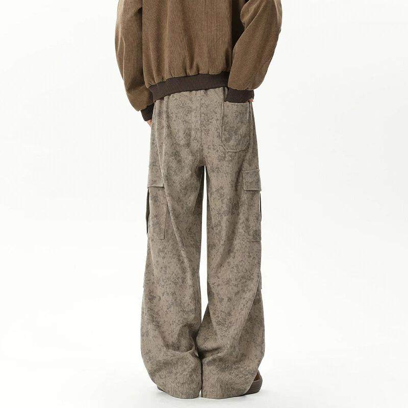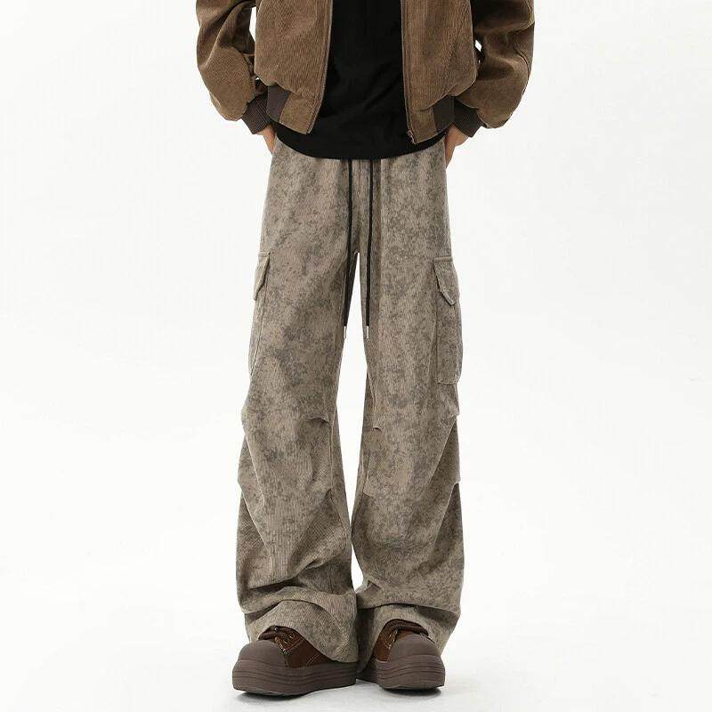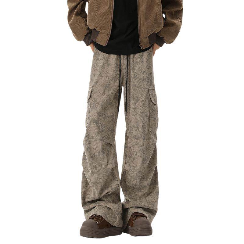 大理石纹灯芯绒裤子男2025春季新款港风潮流褶皱工装裤宽松休闲裤