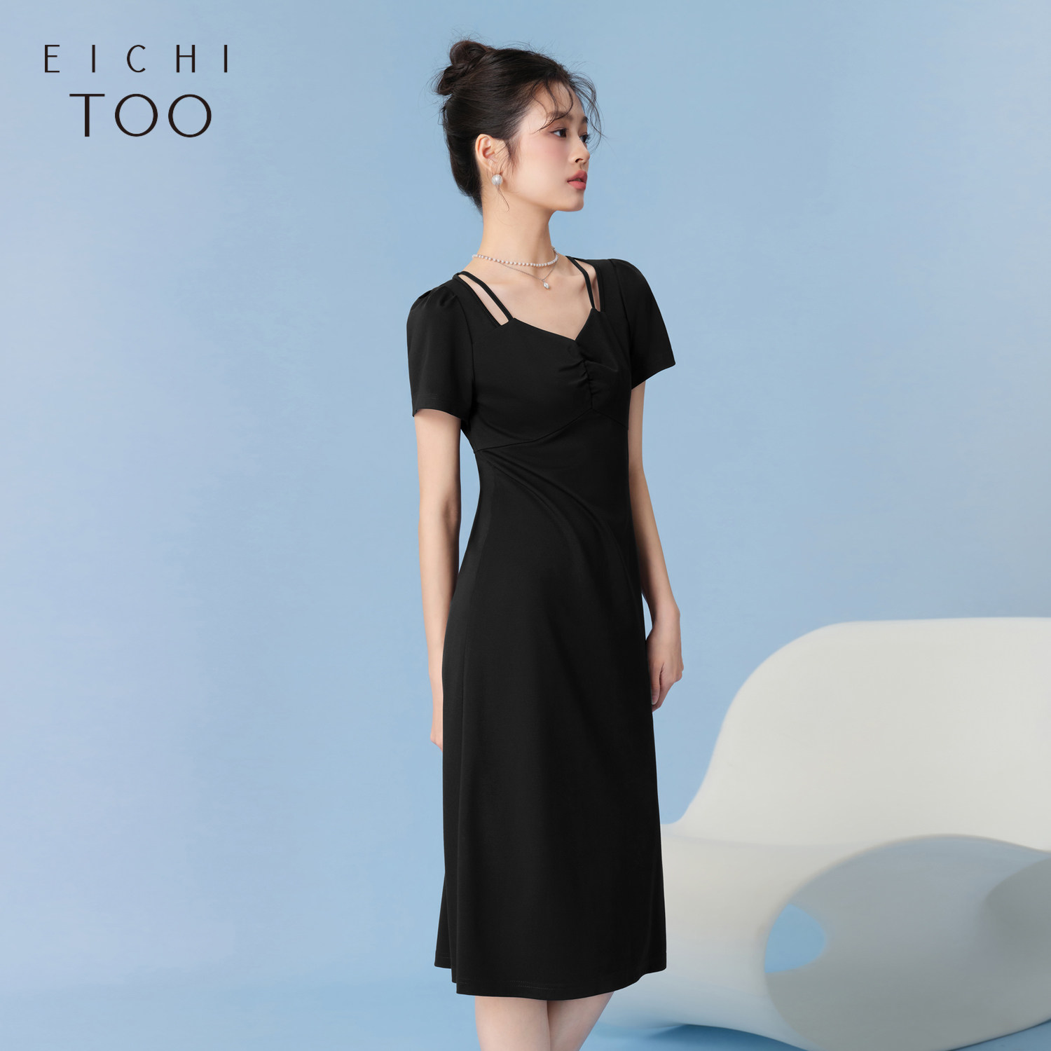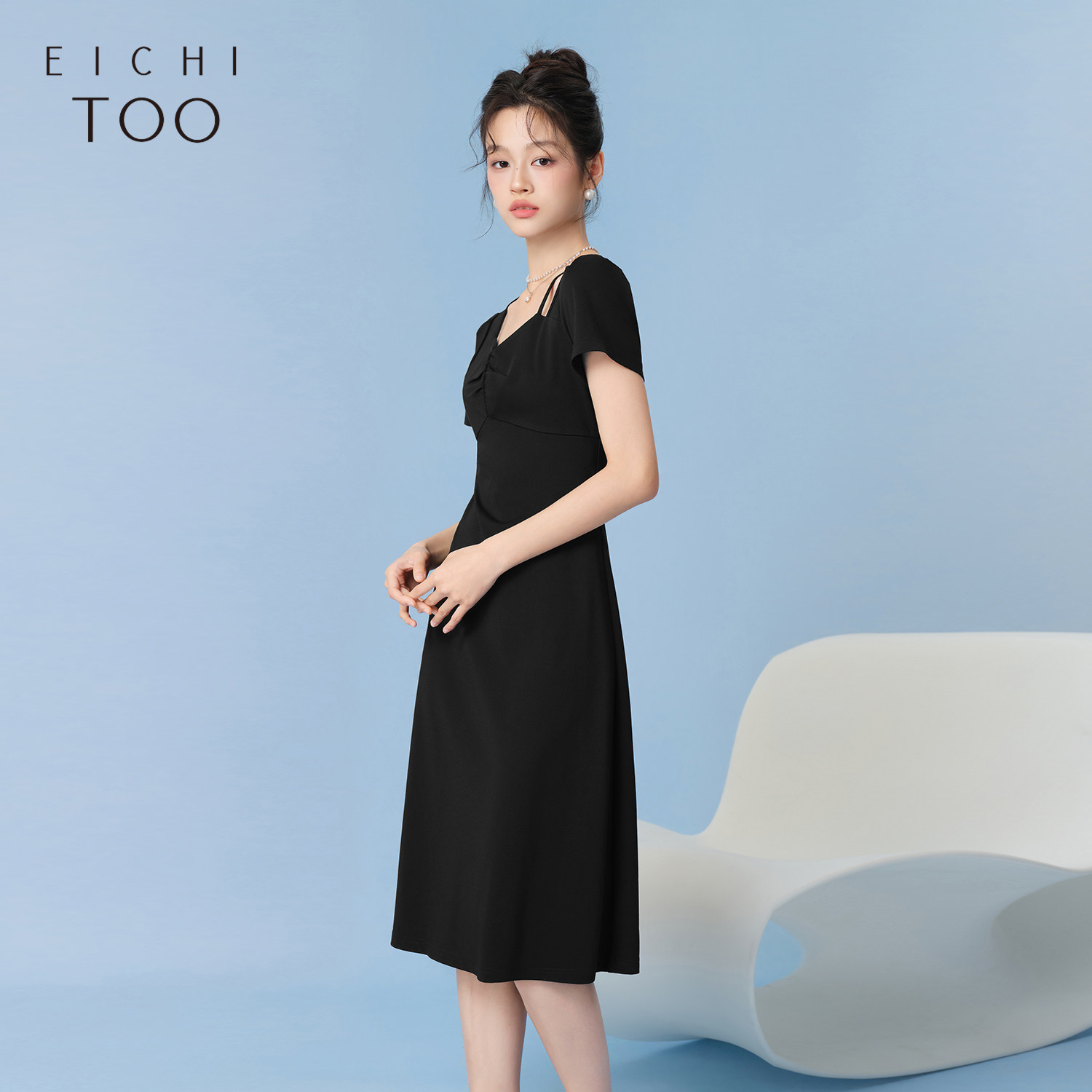 【热销补货】欧时力 褶皱短袖连衣裙女2026春新款收腰显瘦小黑裙