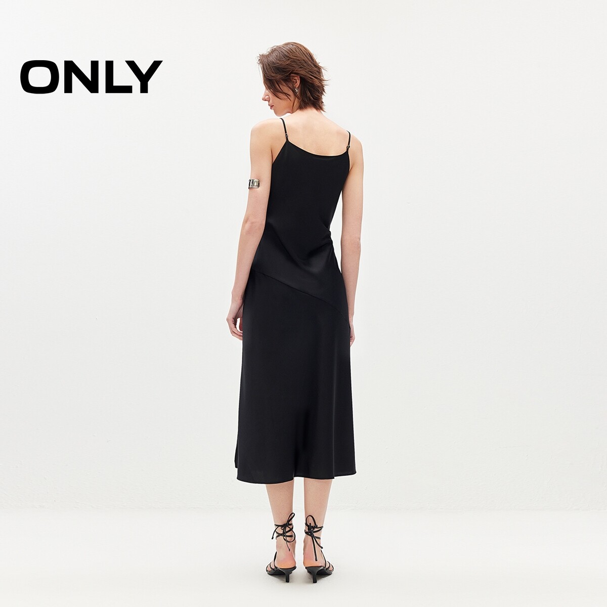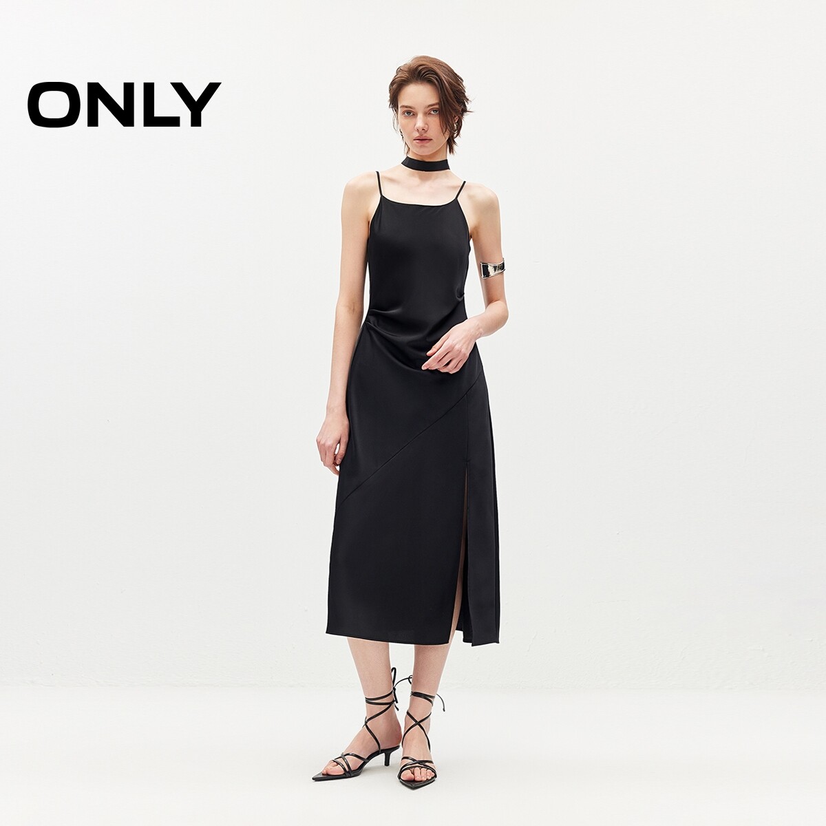 ONLY2026春季新款时尚优雅开叉吊带中长裙小黑裙收腰连衣裙女