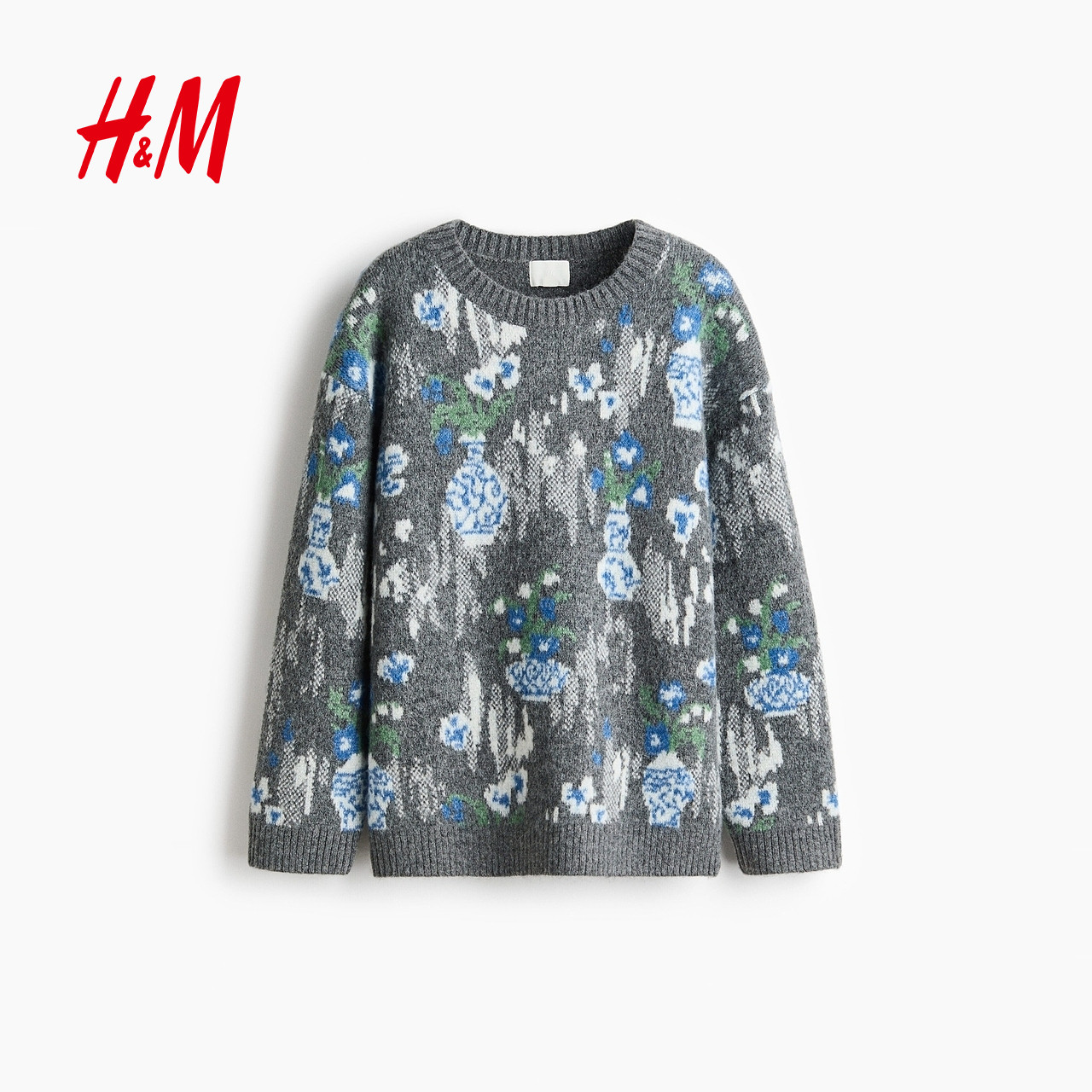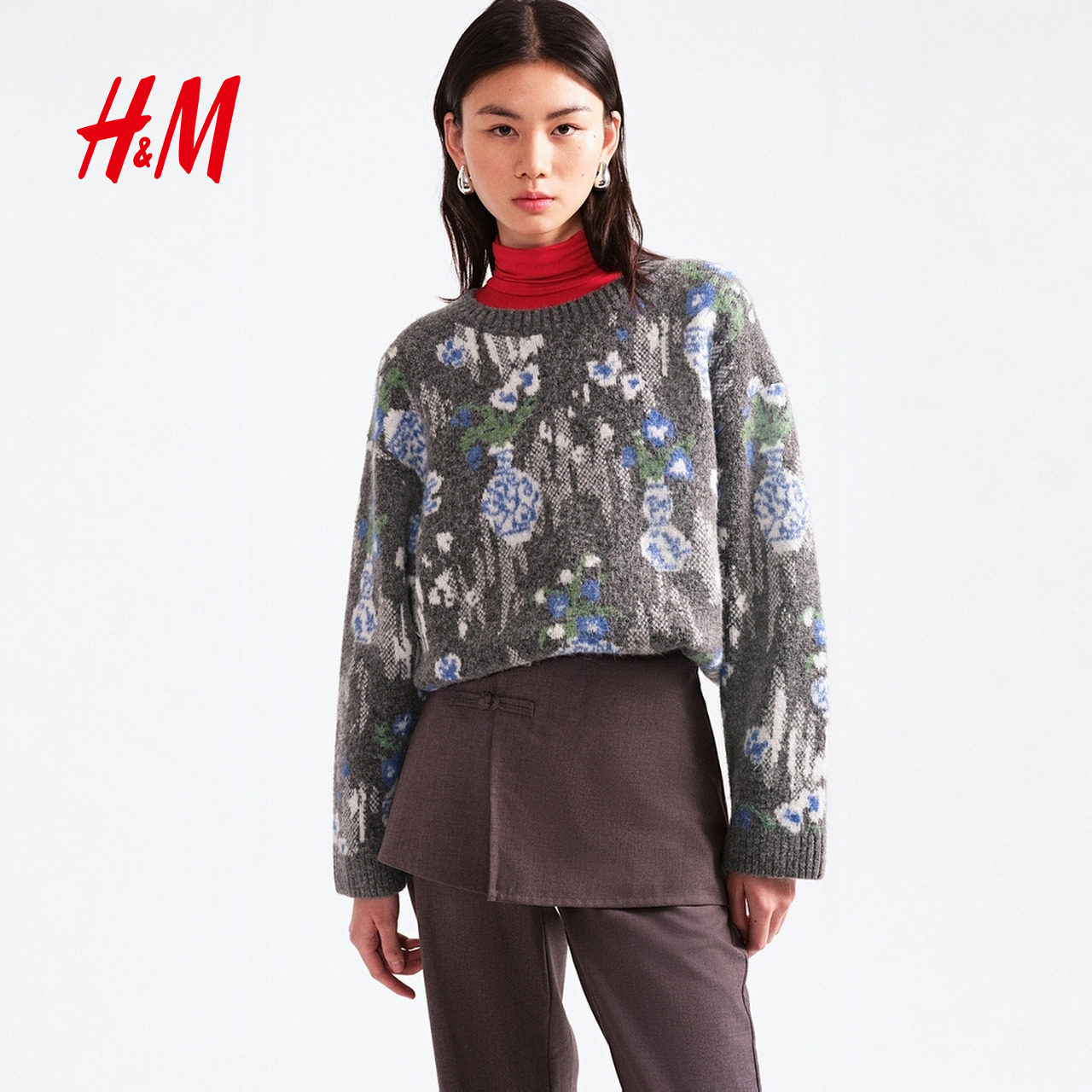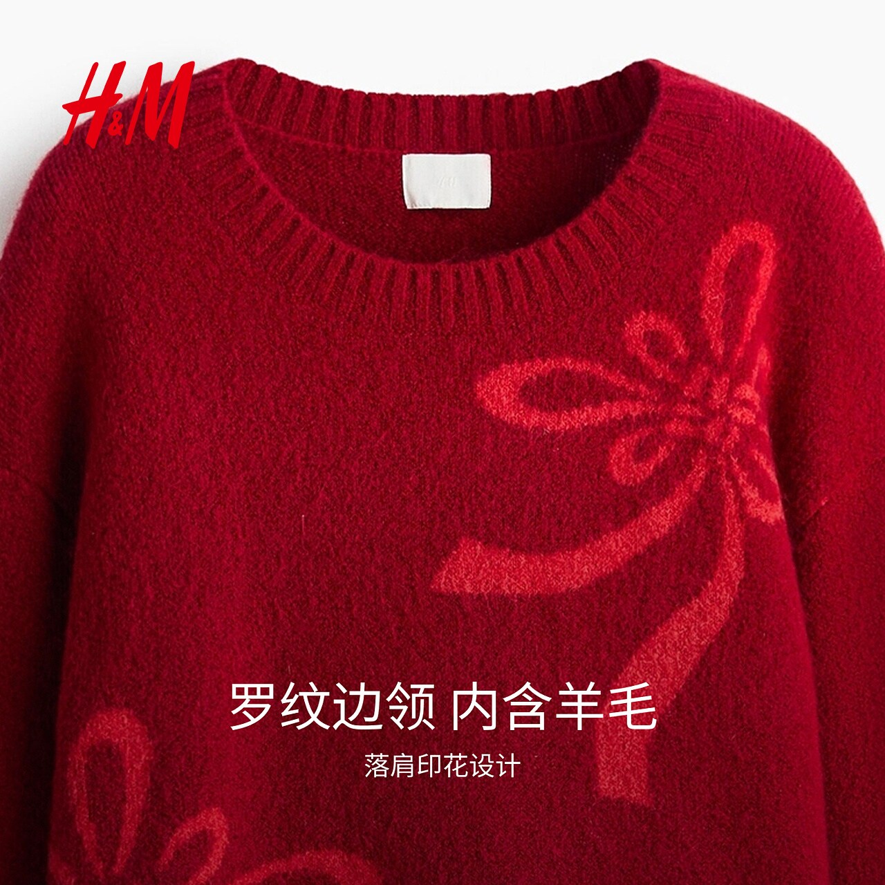 HM女装毛针织衫2026春季新款户外出游圆领印花长袖毛衣1322625