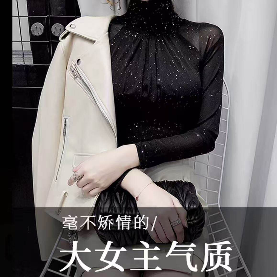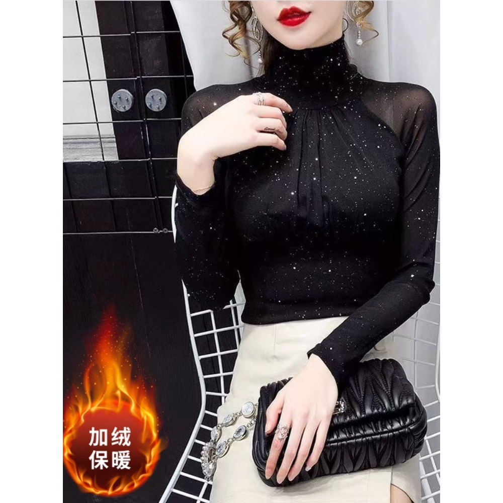 秋冬加绒加厚网纱性感法式复古高领紧身洋气打底长袖时尚小衫上衣