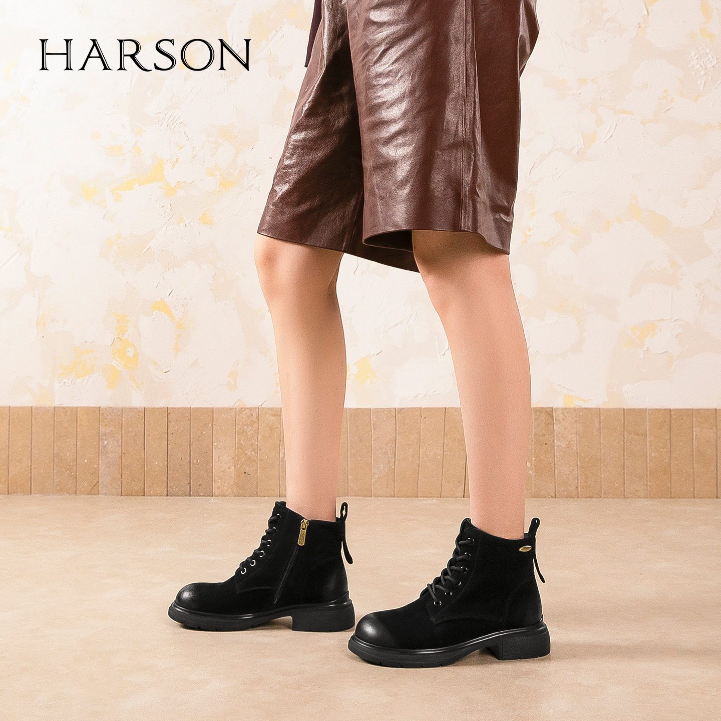 哈森/HARSON【骑士乐章】25冬新款真皮系带马丁靴休闲时尚女短靴