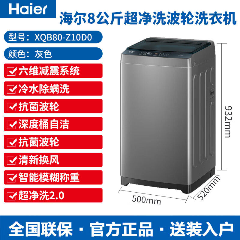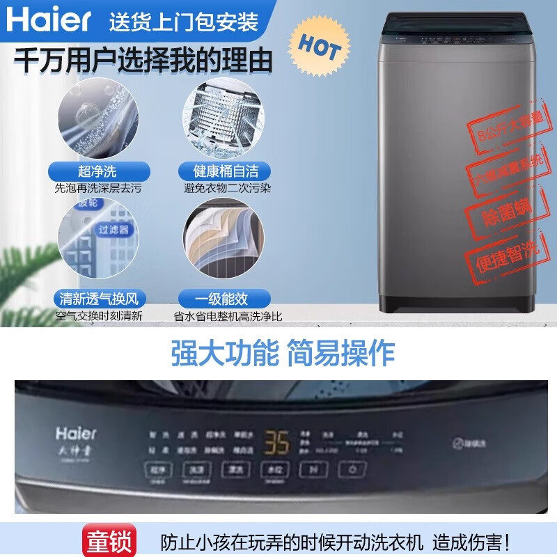 海尔洗衣机一级8kg公斤波轮全自动家用大容量除螨桶洗脱一体