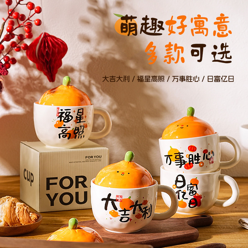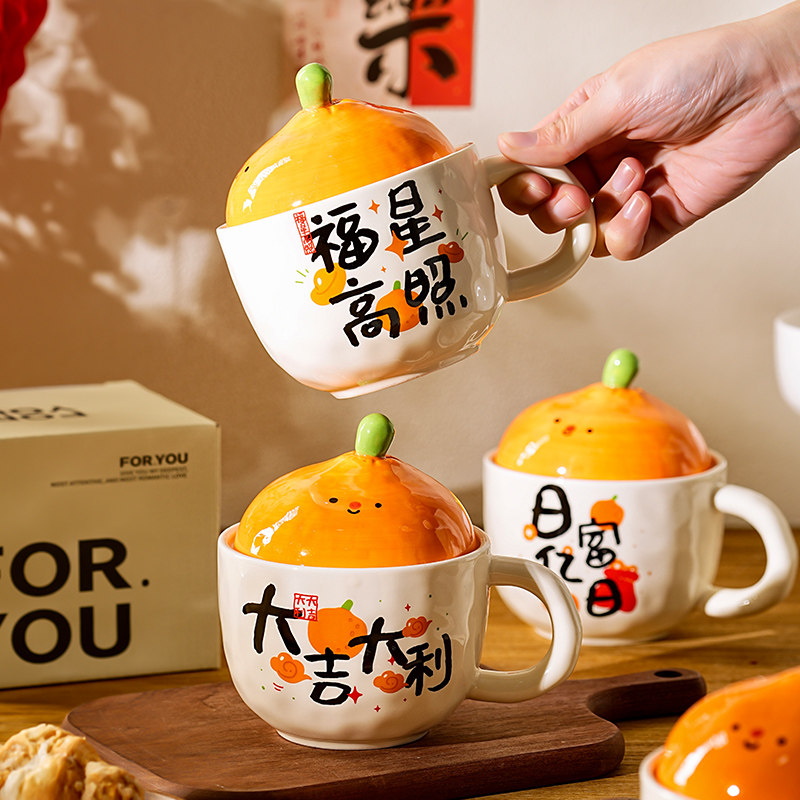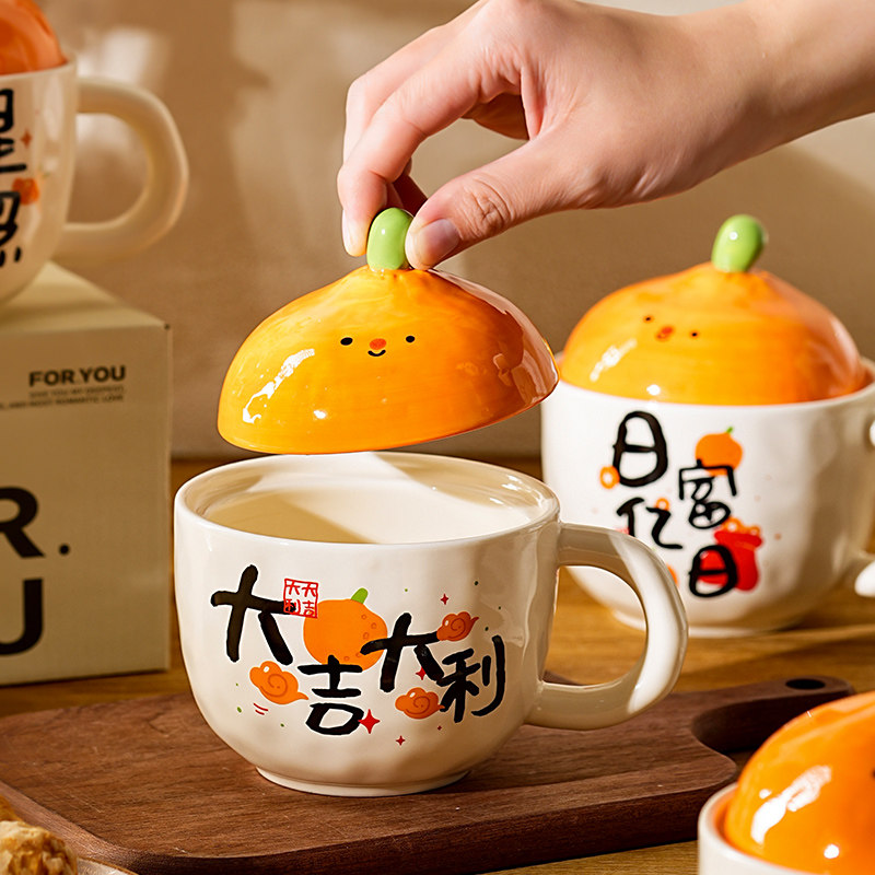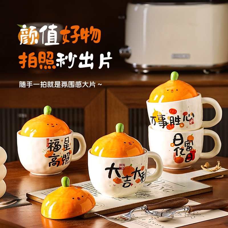 橘子大吉大利带盖马克杯女特别好看的喝水杯子牛奶咖啡杯早餐杯子