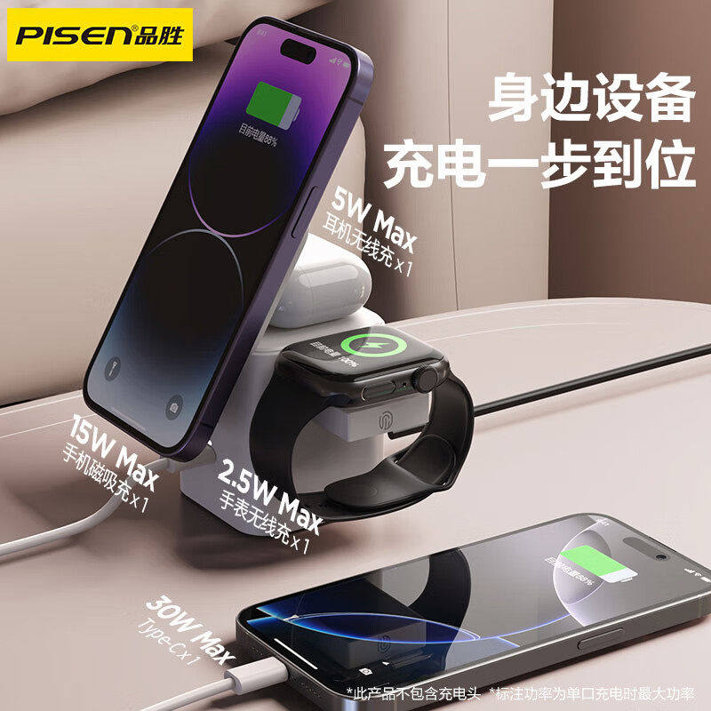 品胜桌面充电站三合一无线充电器45W适用苹果17快充apple watch手表16磁吸magsafe手机iPhone耳机15w底座S11