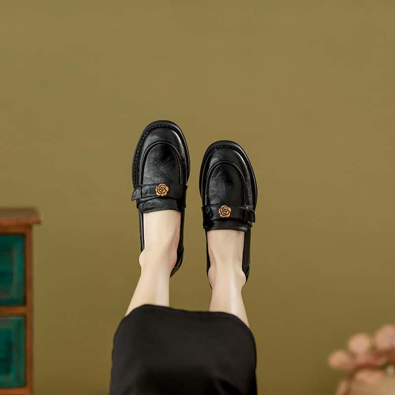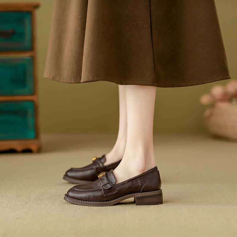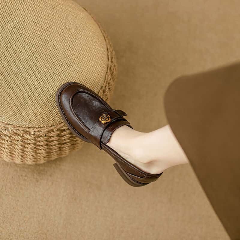 羊皮~棕色山茶花乐福鞋女2025新款通勤粗跟单鞋百搭英伦风小皮鞋