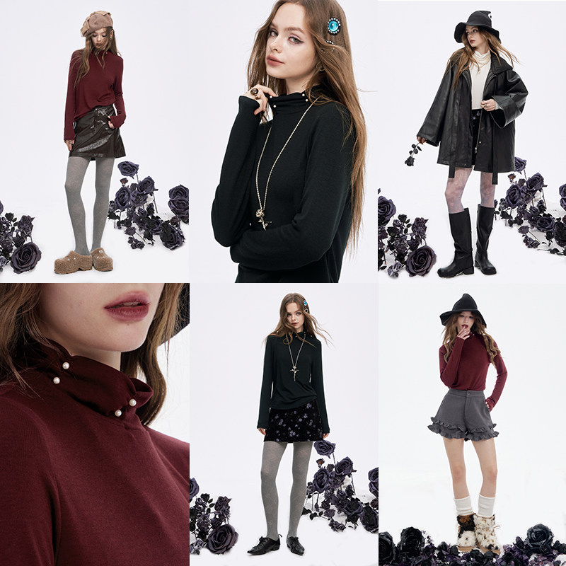 妖精的口袋复古堆堆领内搭打底衫女2026春秋新款修身t恤长袖上衣