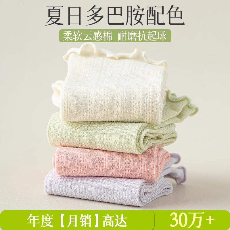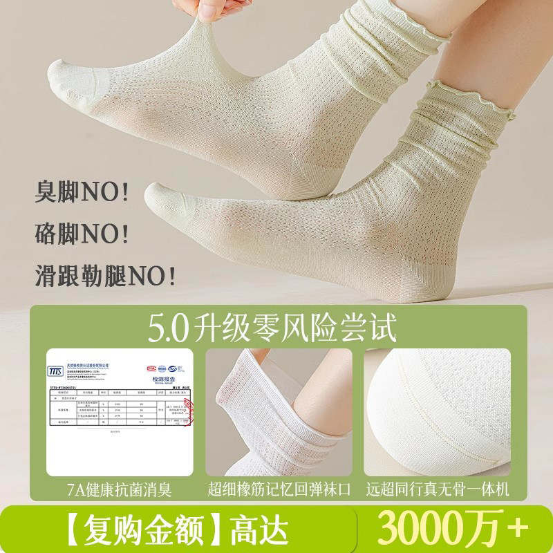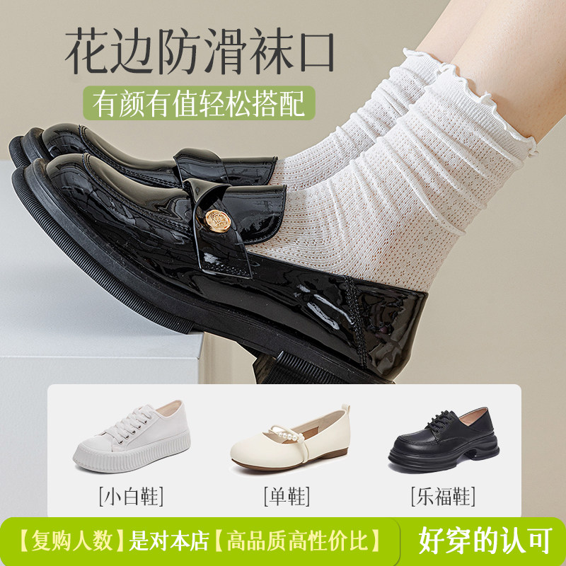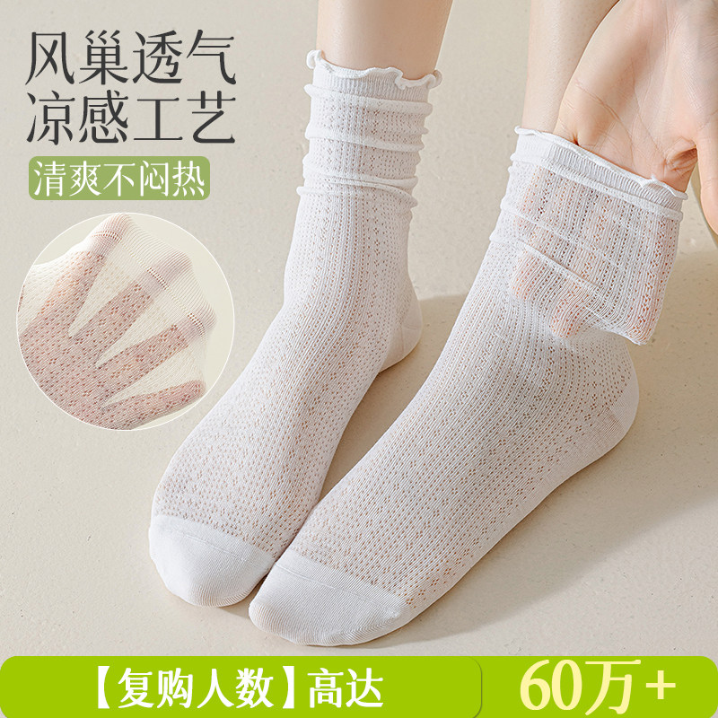 白色袜子女夏季薄款中筒袜纯棉网眼防臭透气夏天女士木耳边堆堆袜