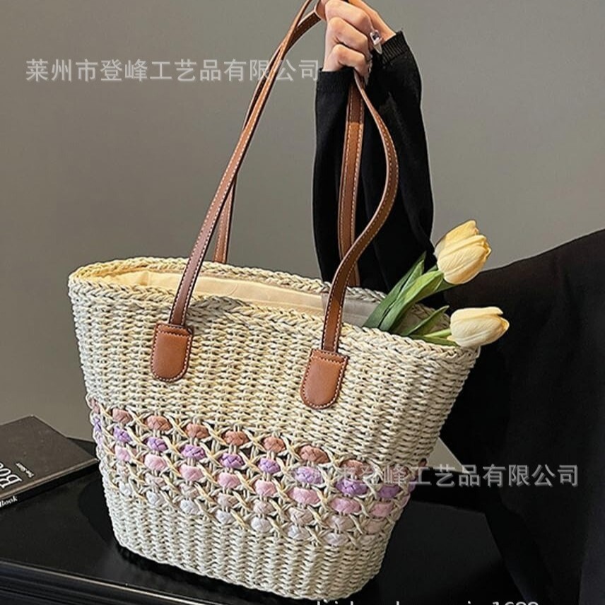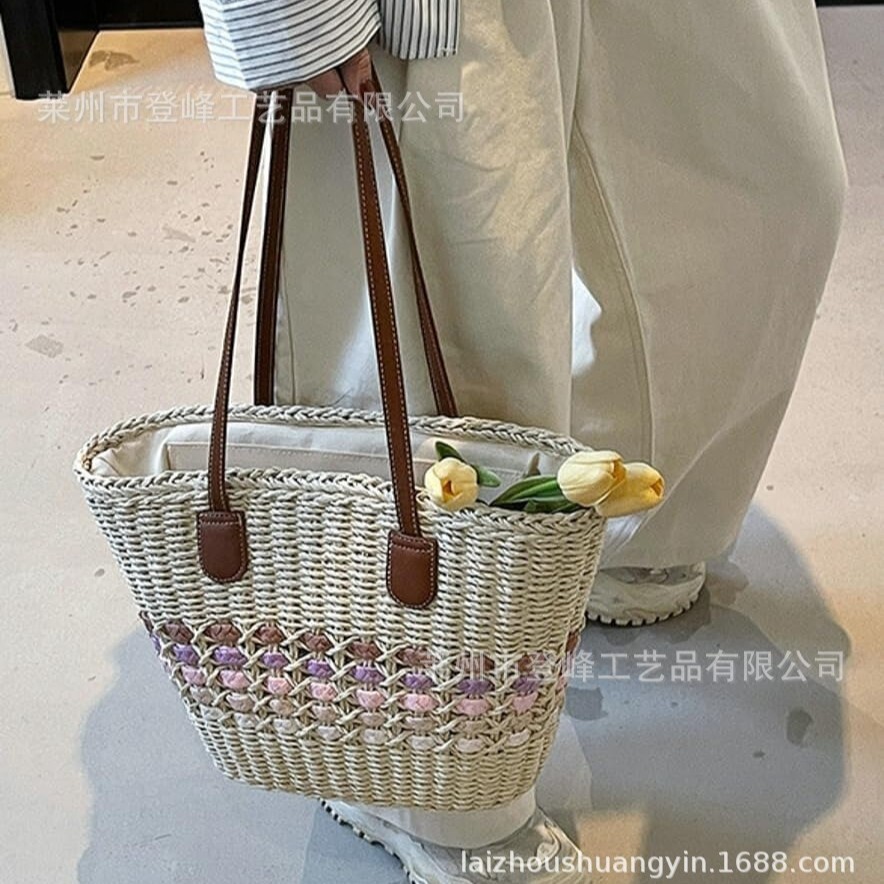 复古风草编夏季沙滩手提袋藤编包手工编织单肩包女士托特包通勤包