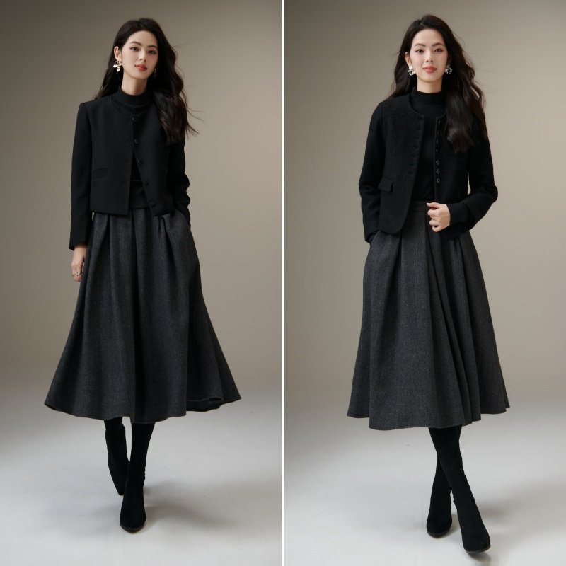 MJ STYLE灰色百褶西装裙女秋冬半身裙高腰休闲大摆a字过膝中长裙