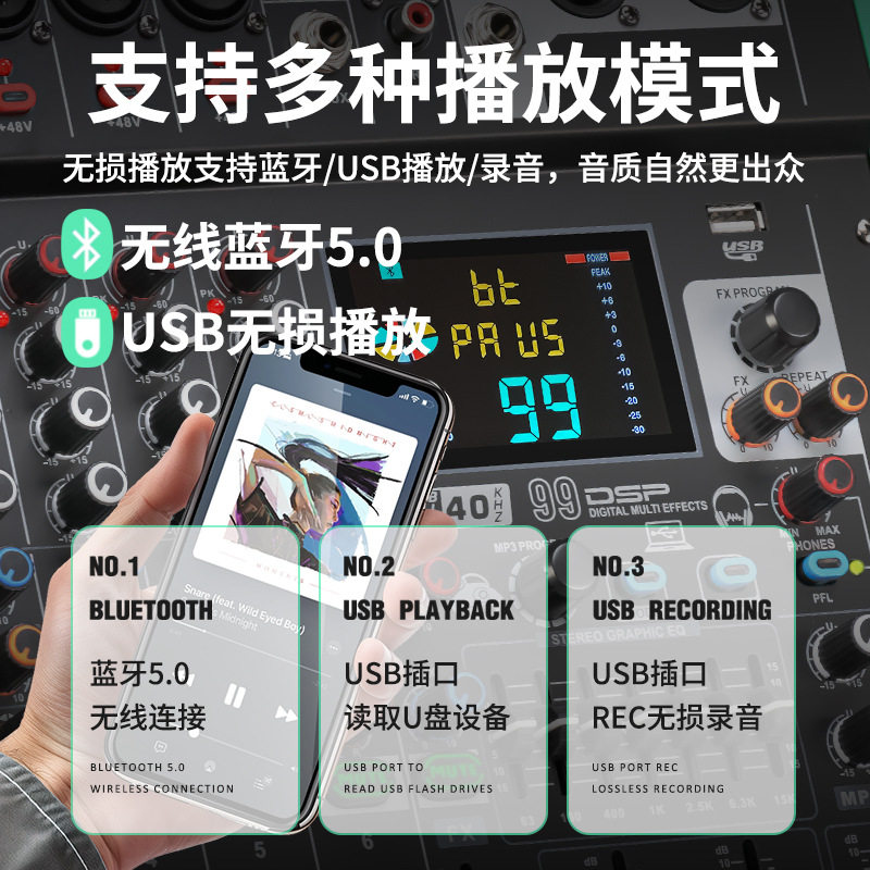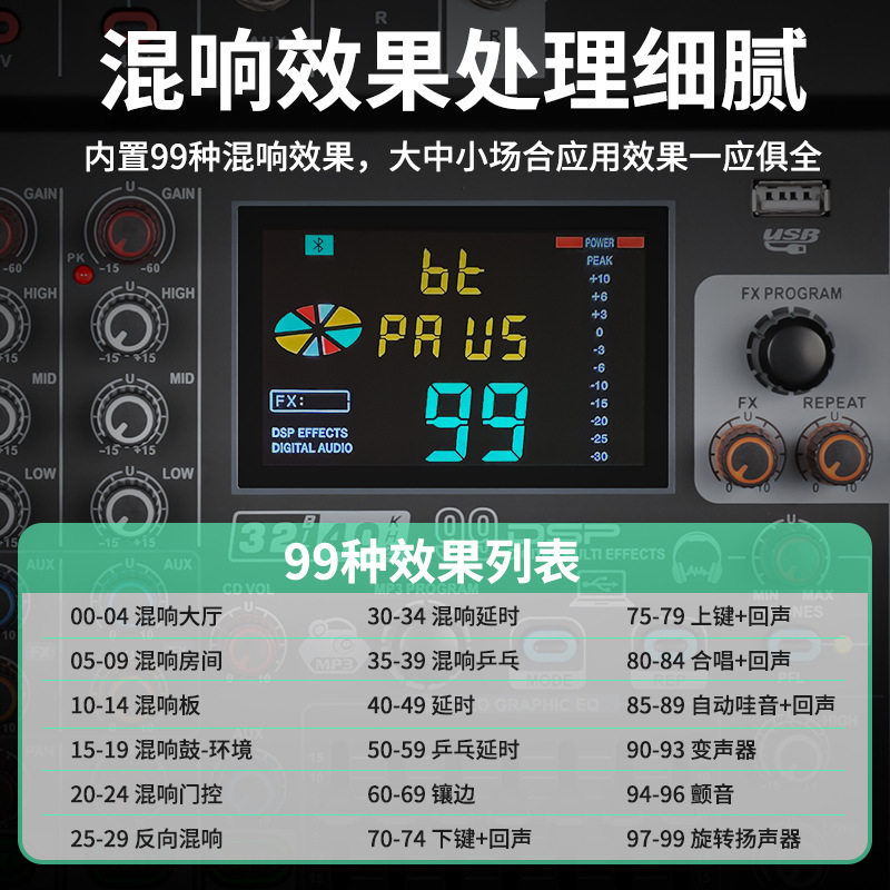 专业带功放调音台99DSP混响效果USB蓝牙舞台演出婚庆家用k声卡