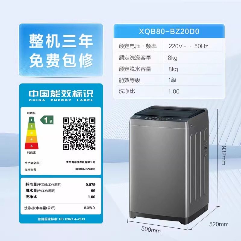 海尔直驱变频8kg公斤波轮洗衣机全自动家用大容量1级新款小型20D0