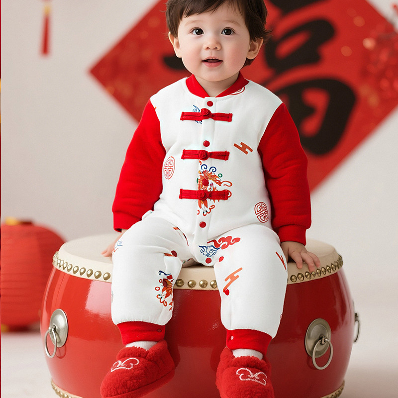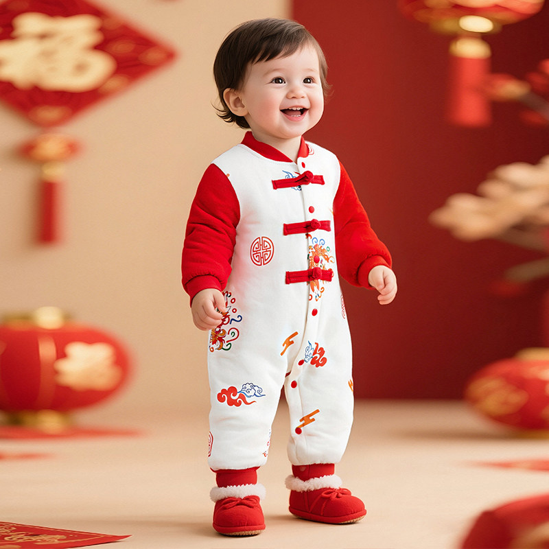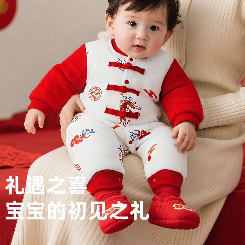 婴儿拜年服新年喜庆衣服连体衣冬季新生初生男女宝宝满月周岁百天