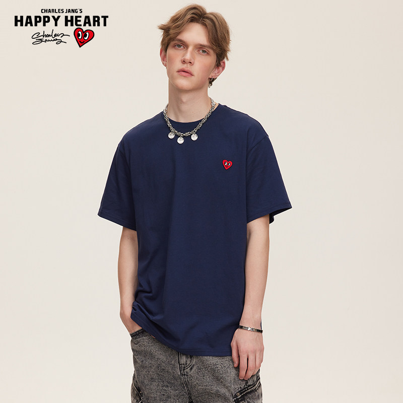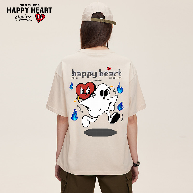 查尔斯桃心 像素幽灵爱心印花纯棉短袖T恤男夏季美式休闲圆领上衣