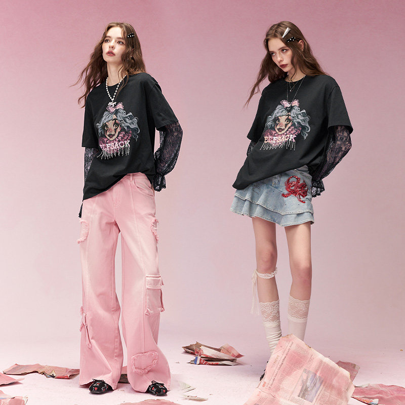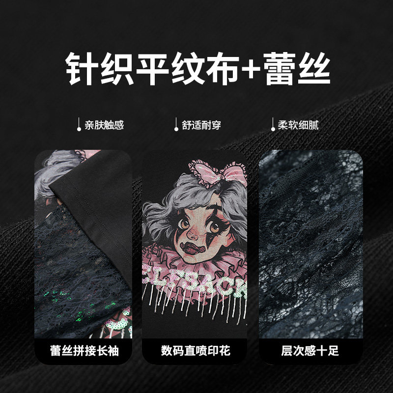 妖精的口袋蕾丝拼接黑色印花长袖t恤女2026春新款设计感宽松上衣