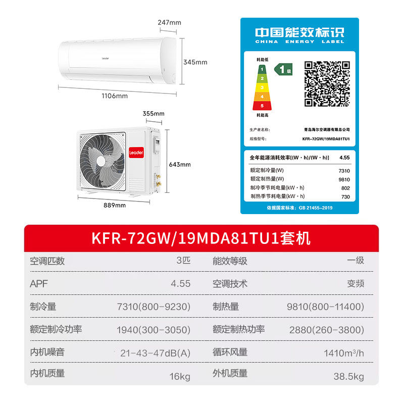 [政府补贴]海尔出品统帅空调3匹一级能效变频客厅卧室挂机72MDA