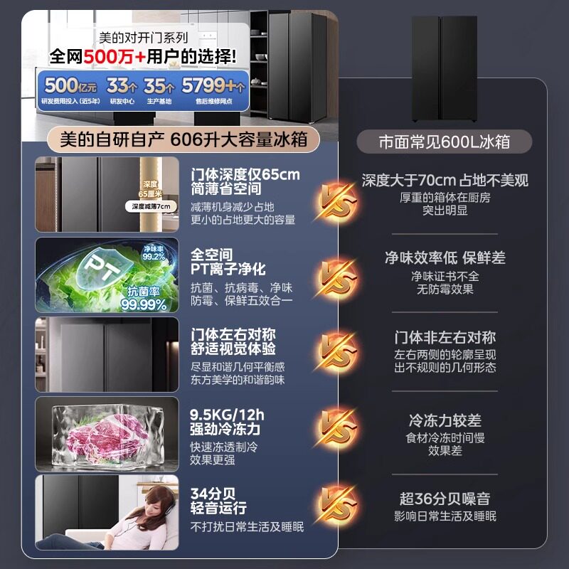 [全国补贴]美的606电冰箱双开门大容量家用变频一级能效风冷无霜