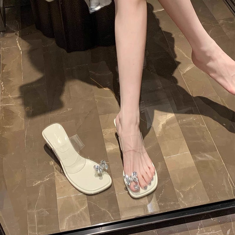 高跟不累脚绝美法式凉鞋女真皮蝴蝶结夏季水钻透明仙女粗跟凉拖鞋