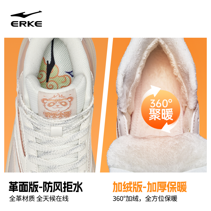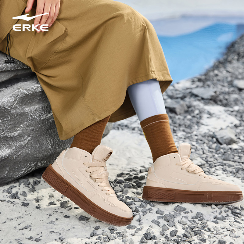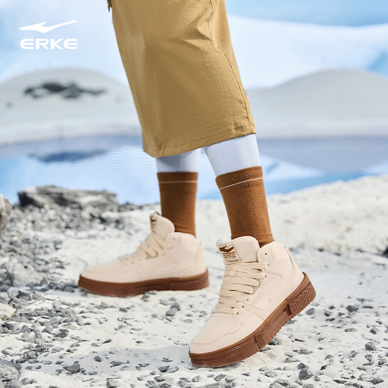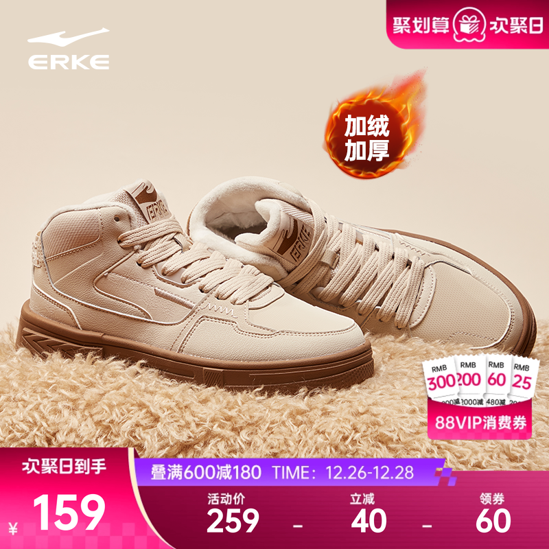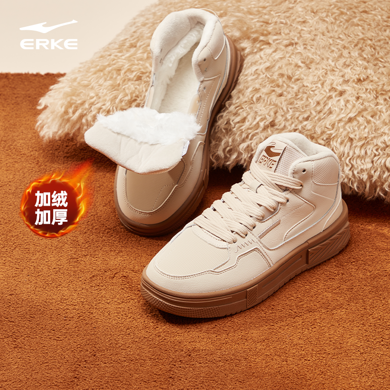 鸿星尔克板鞋女鞋冬季高帮运动鞋厚底鞋子皮面休闲鞋加绒保暖棉鞋