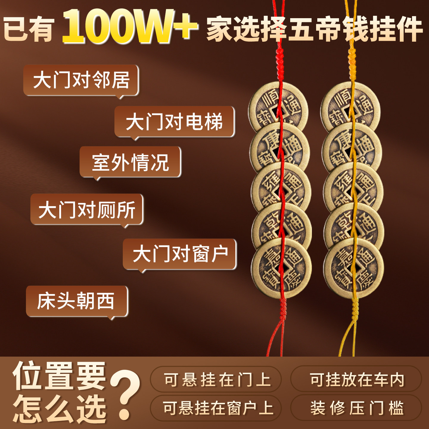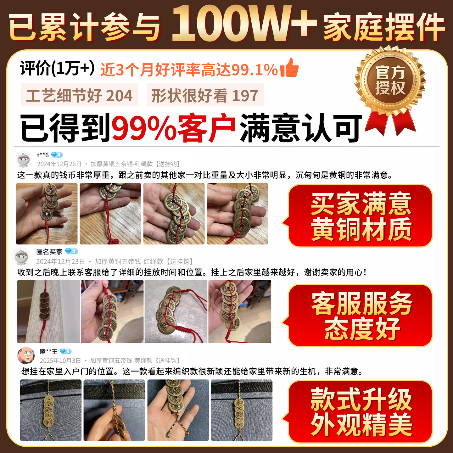 纯黄铜加厚五帝钱门对门挂件彩红黄绳压门槛铜钱币真品六帝钱摆件
