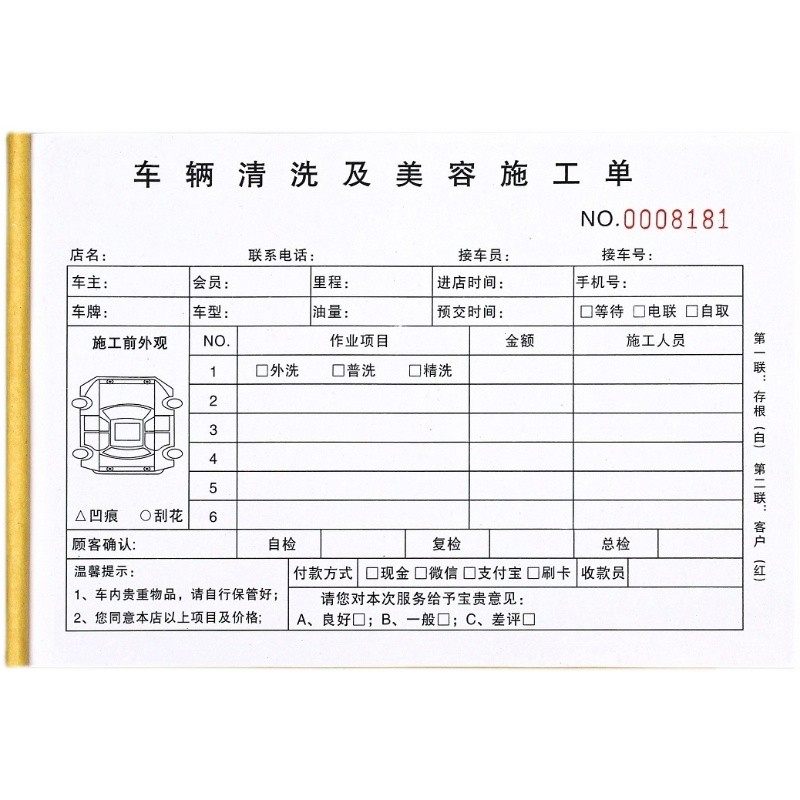 汽车维修装潢美容施工单定做二三联派工单洗车店车辆清洗接车票据