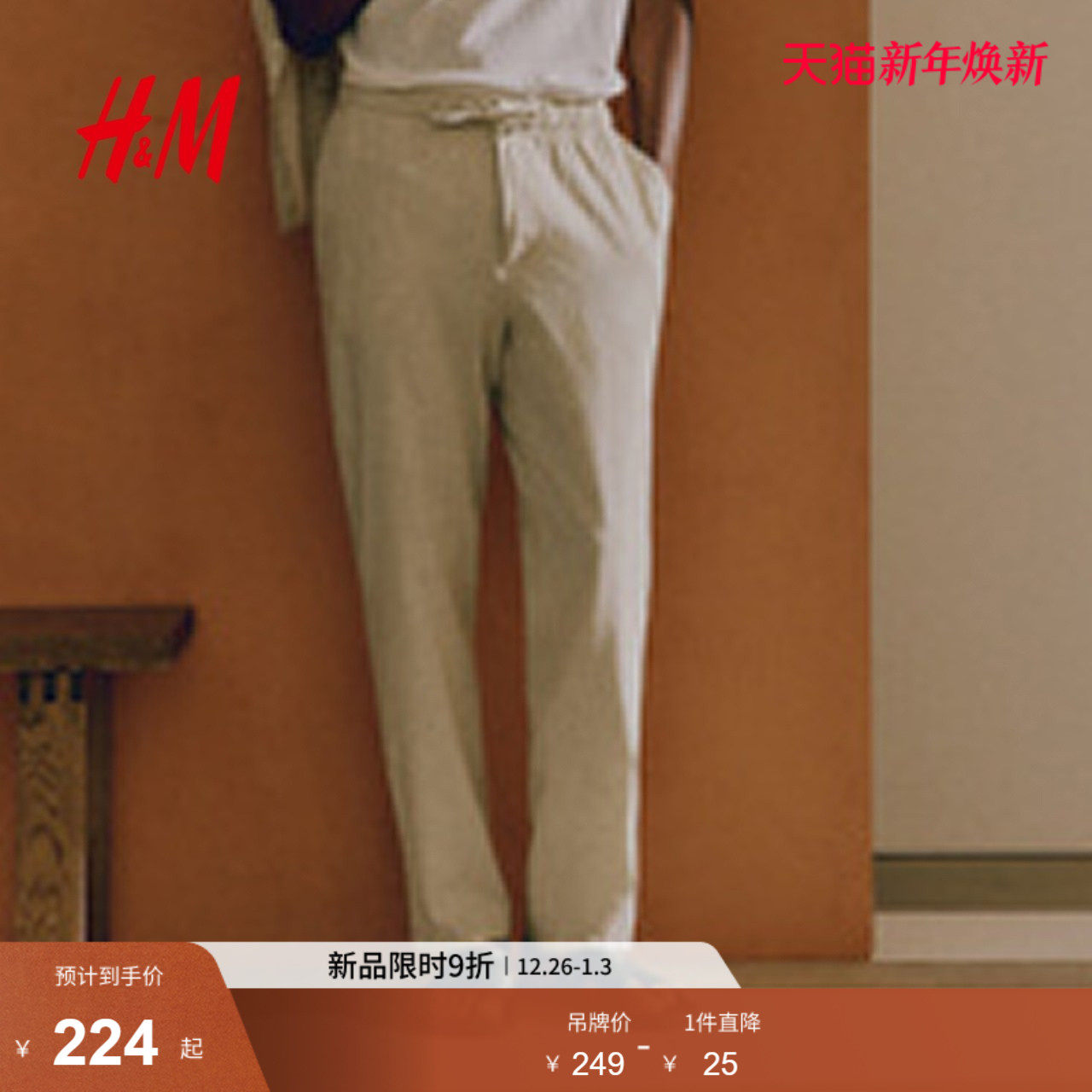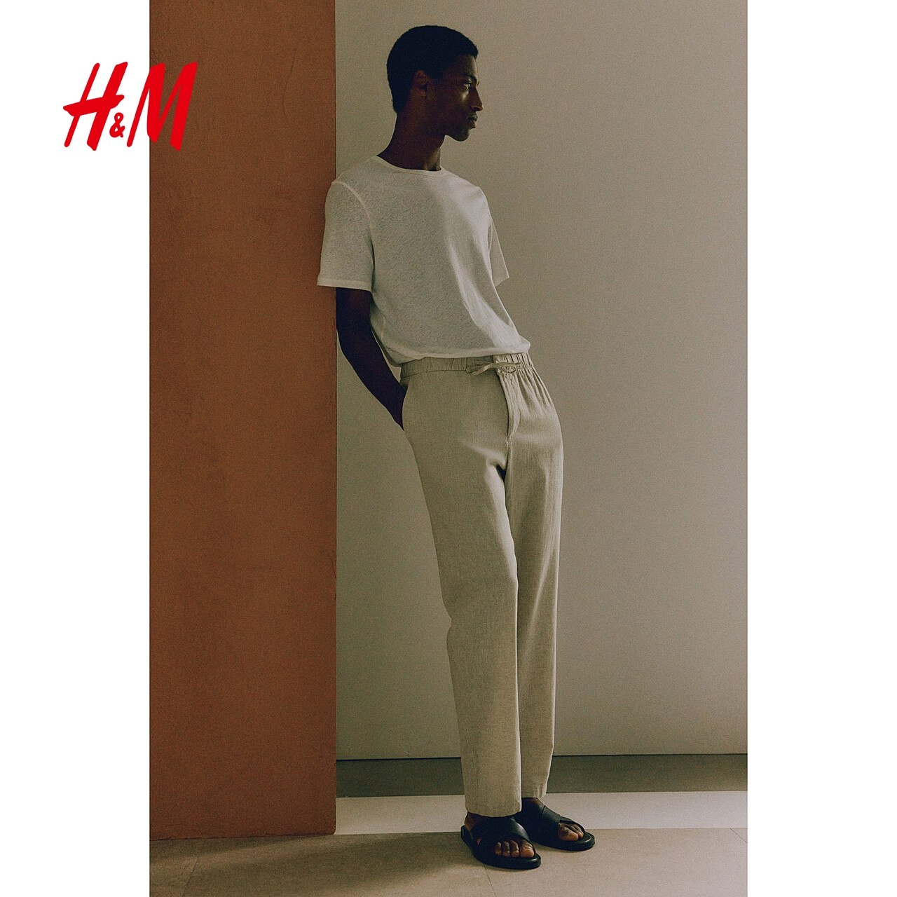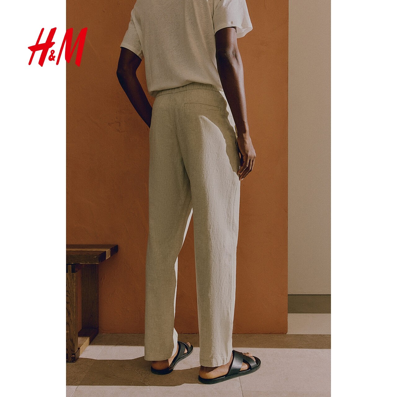 HM男装休闲裤冬季薄款亚麻混纺透气宽松直筒亚麻混纺长裤1064346