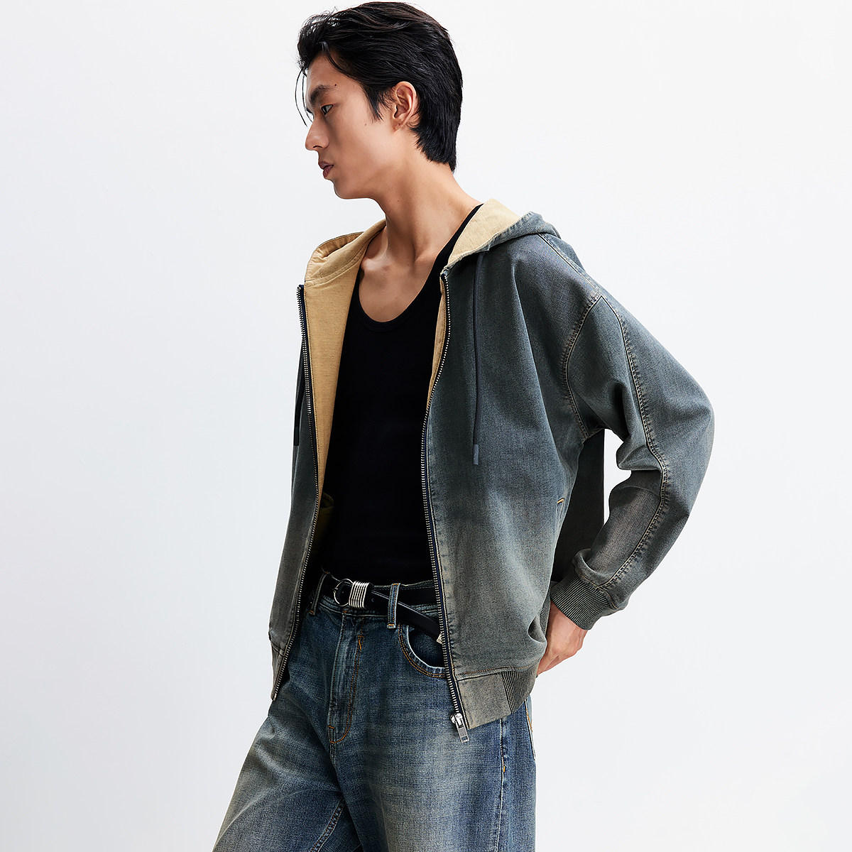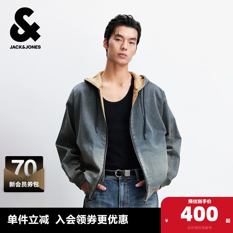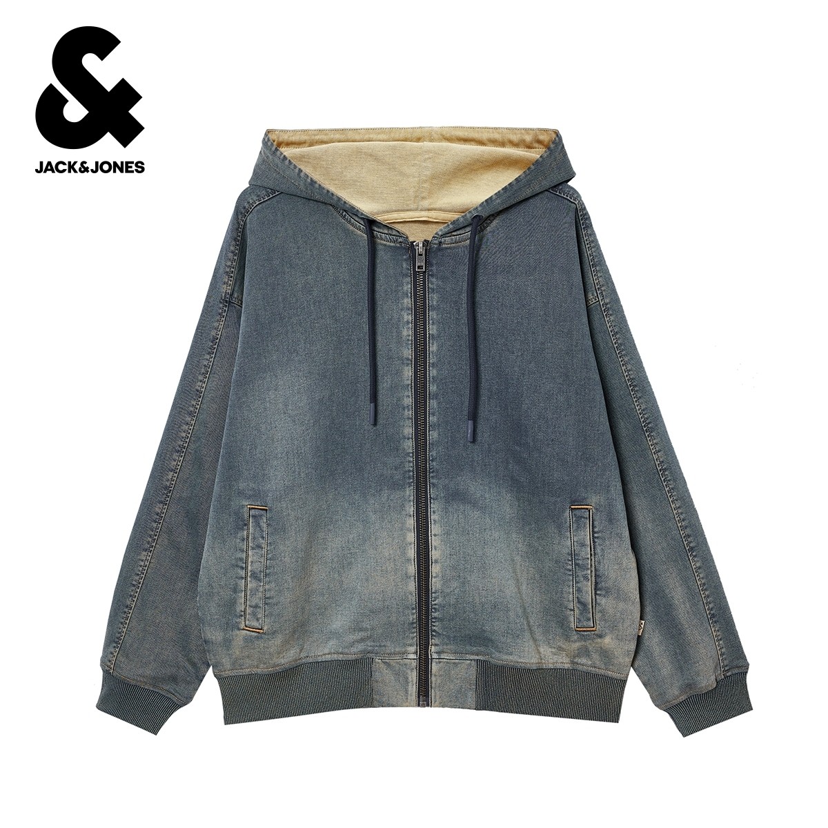 杰克琼斯奥特莱斯夹克男生2025年秋季款牛仔连帽外套做旧水洗上衣