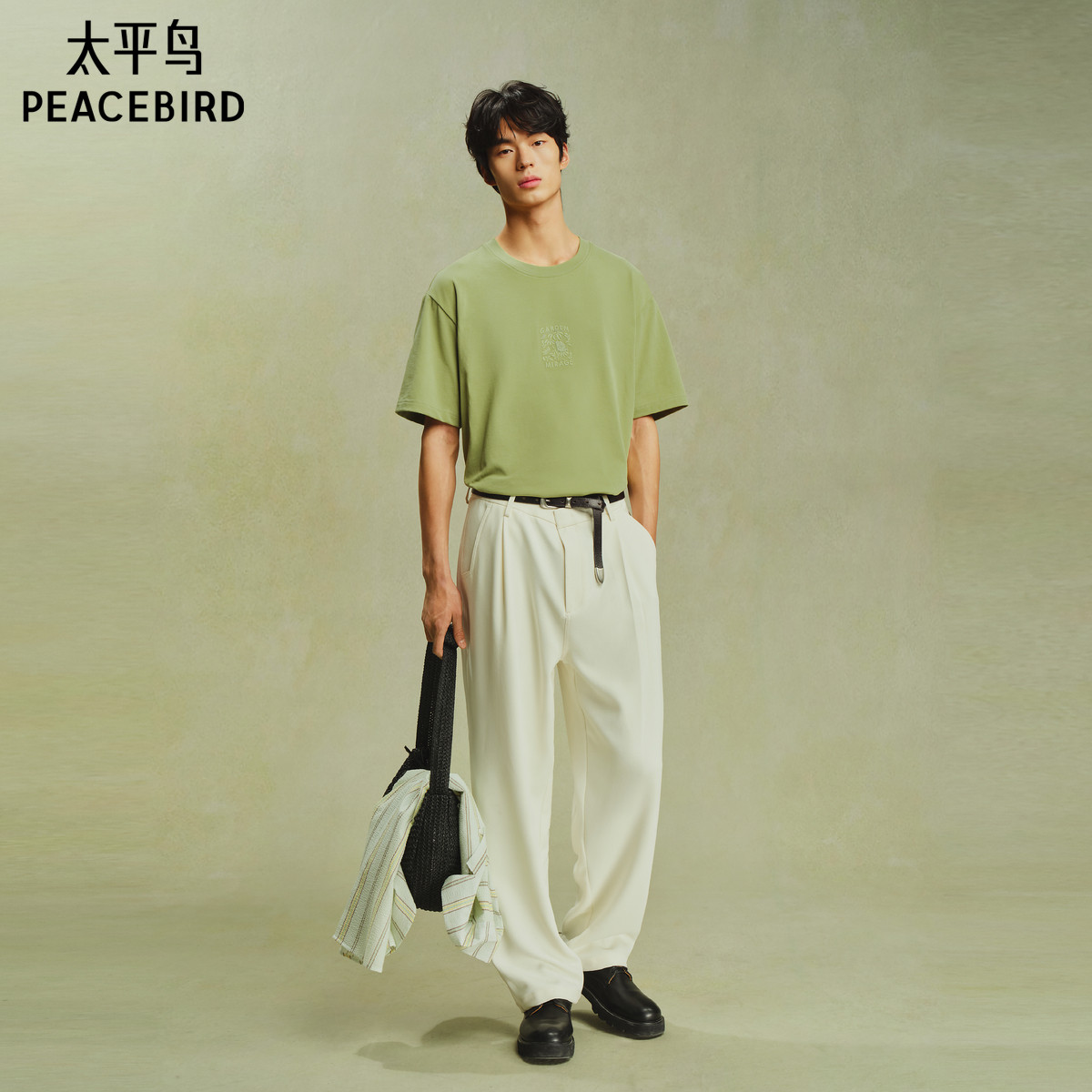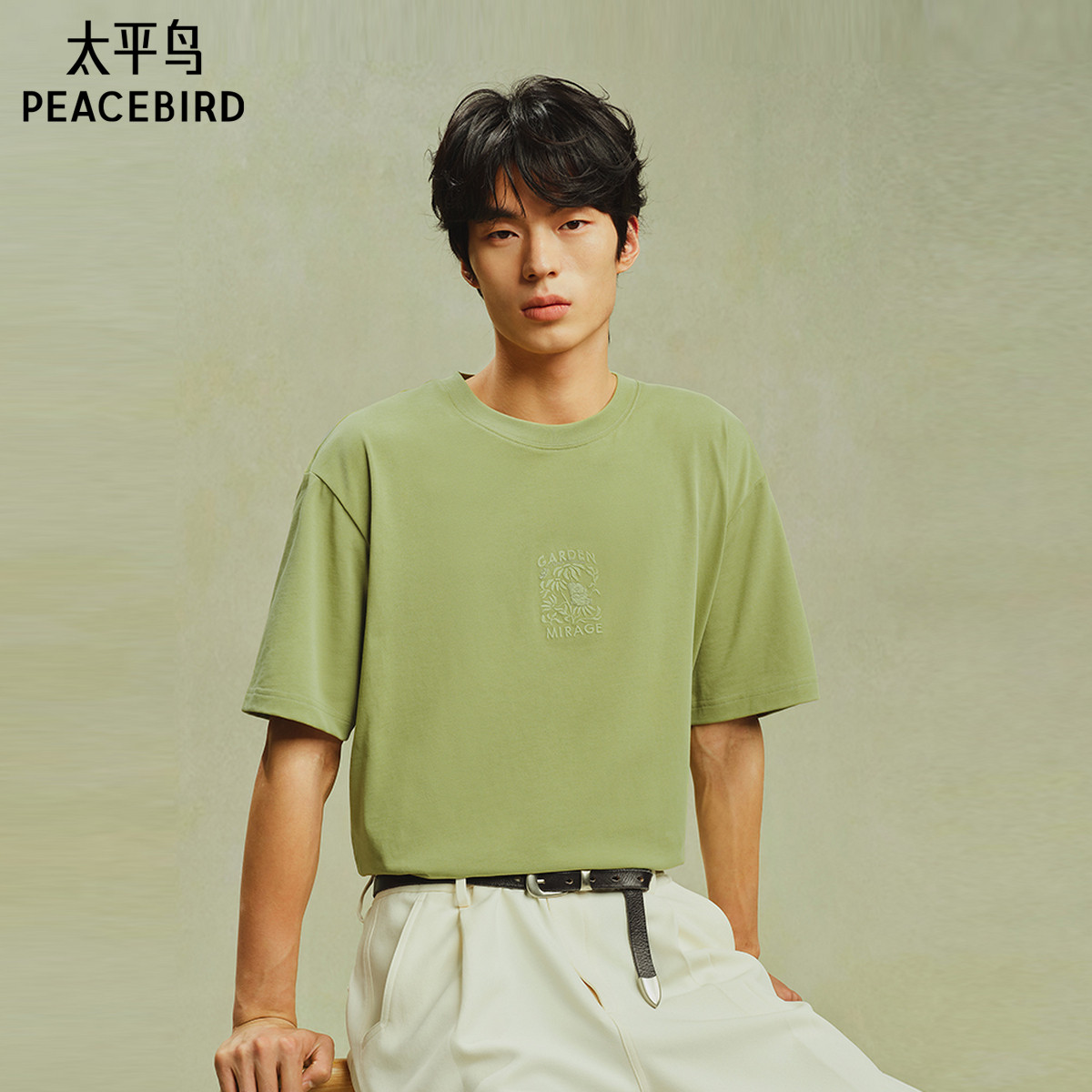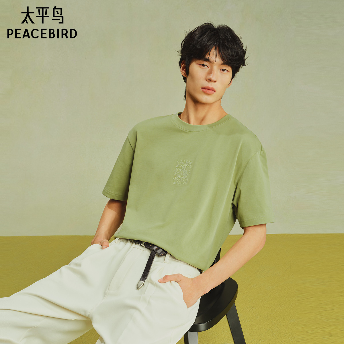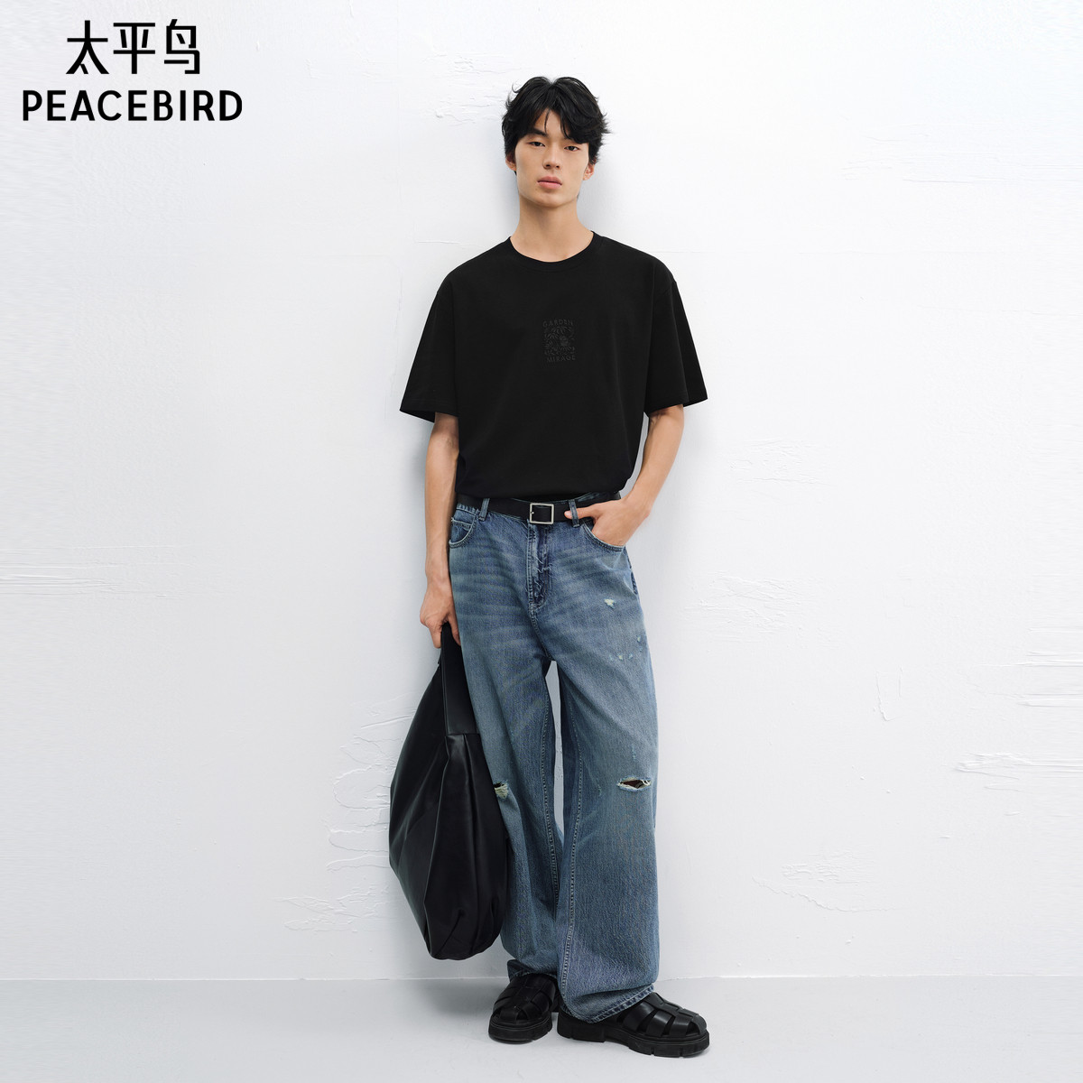 【艺术家系列】太平鸟男装重磅纯色T恤25夏新款刺绣体恤衫时尚黑t