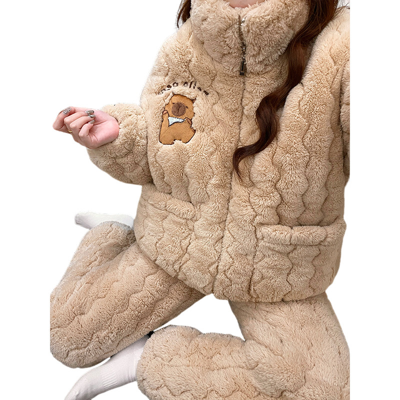 卡皮巴拉睡衣女秋冬季珊瑚绒加厚三层夹棉2025新款保暖冬天家居服
