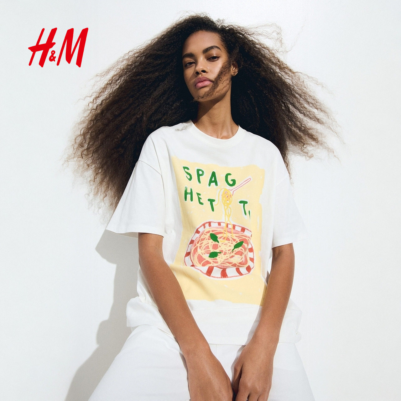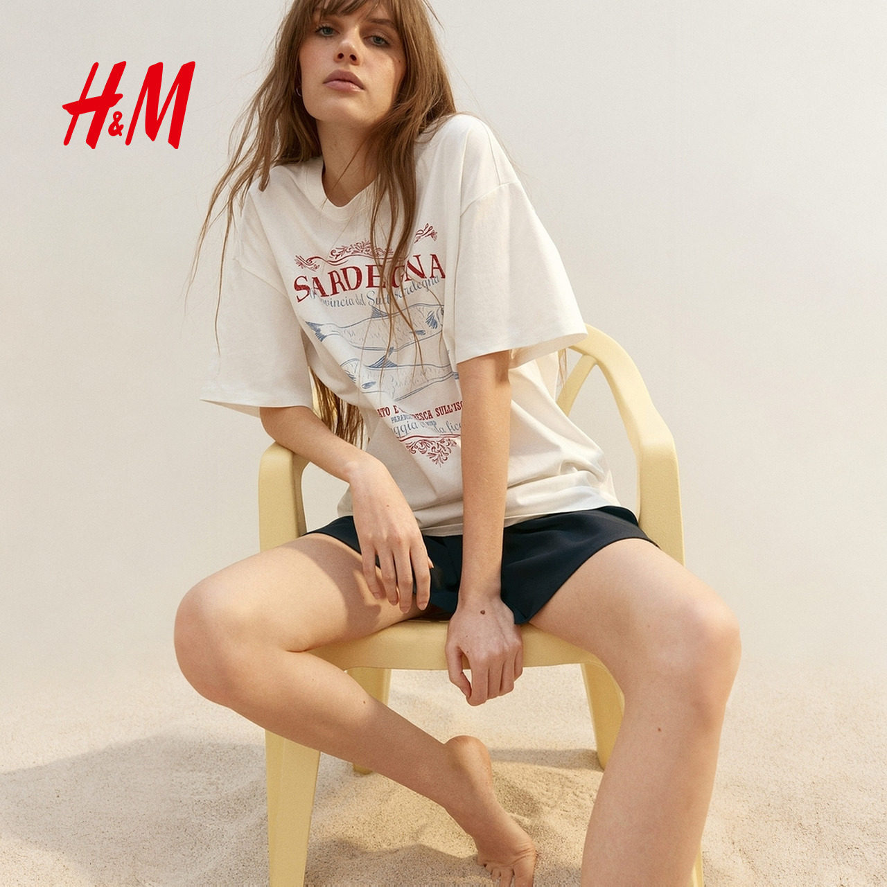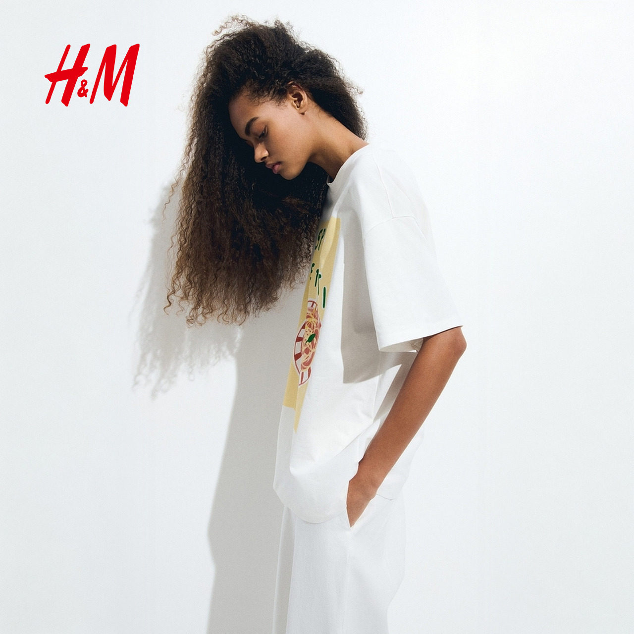 HM女装T恤冬季时尚简约潮流休闲大廓形印花T恤1296379
