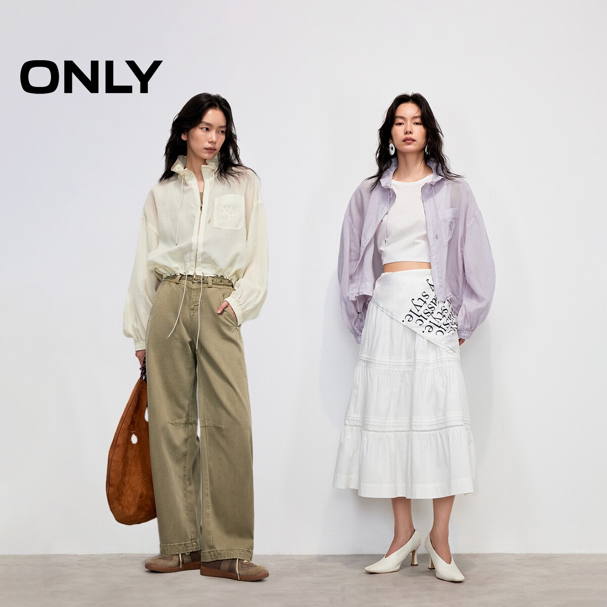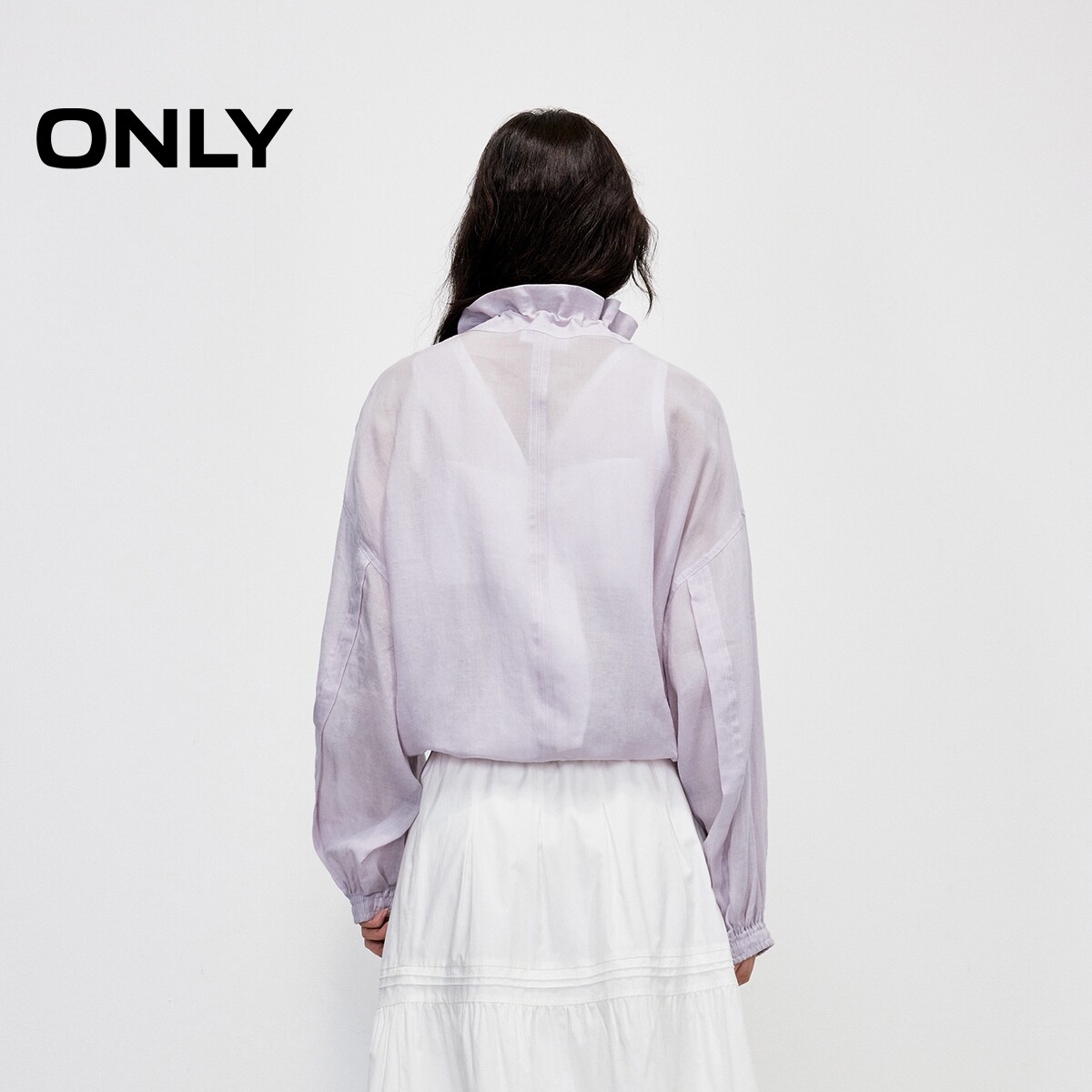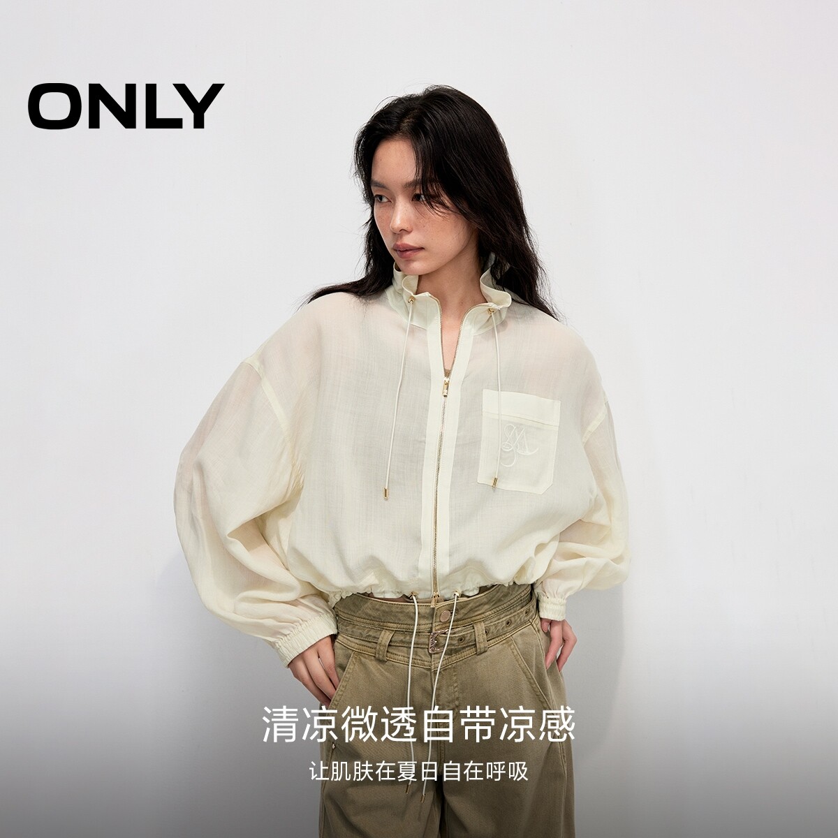 【ONLY奥莱】春季户外风透感面料宽松落肩纯色抽绳立领长袖外套女