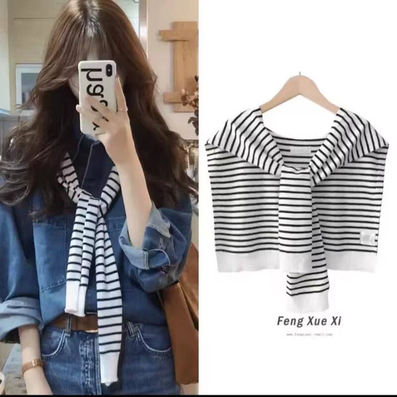 2026条纹针织披肩女夏季空调房外搭配裙子春秋新款打结围巾护颈椎