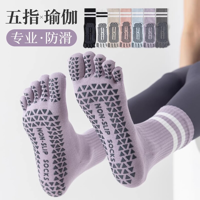 五指瑜伽袜子防滑专业女秋冬普拉提训练运动专用长筒分趾白色紫色