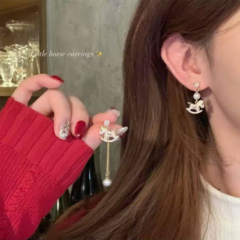 新年巨好看耳饰爆闪满锆金色小马珍珠吊坠耳钉女轻奢高级感耳环