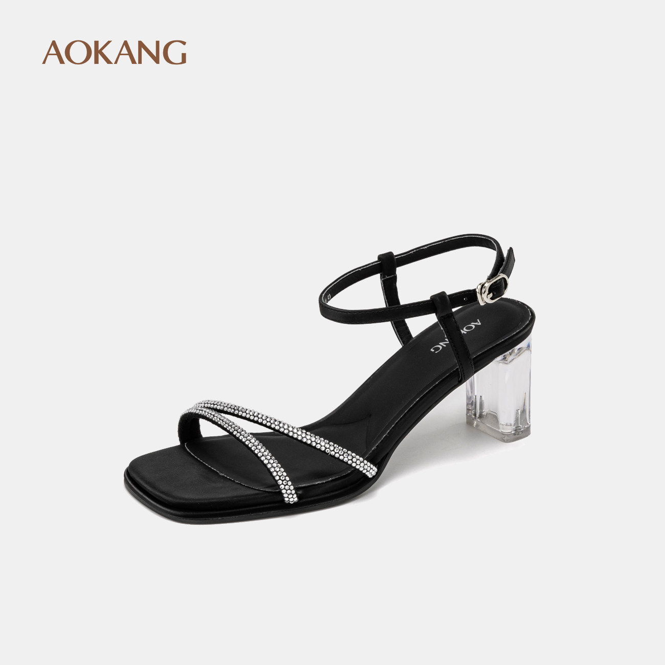奥康女鞋 夏季气质水钻一字带高跟露趾女士时装凉鞋透明粗跟凉鞋