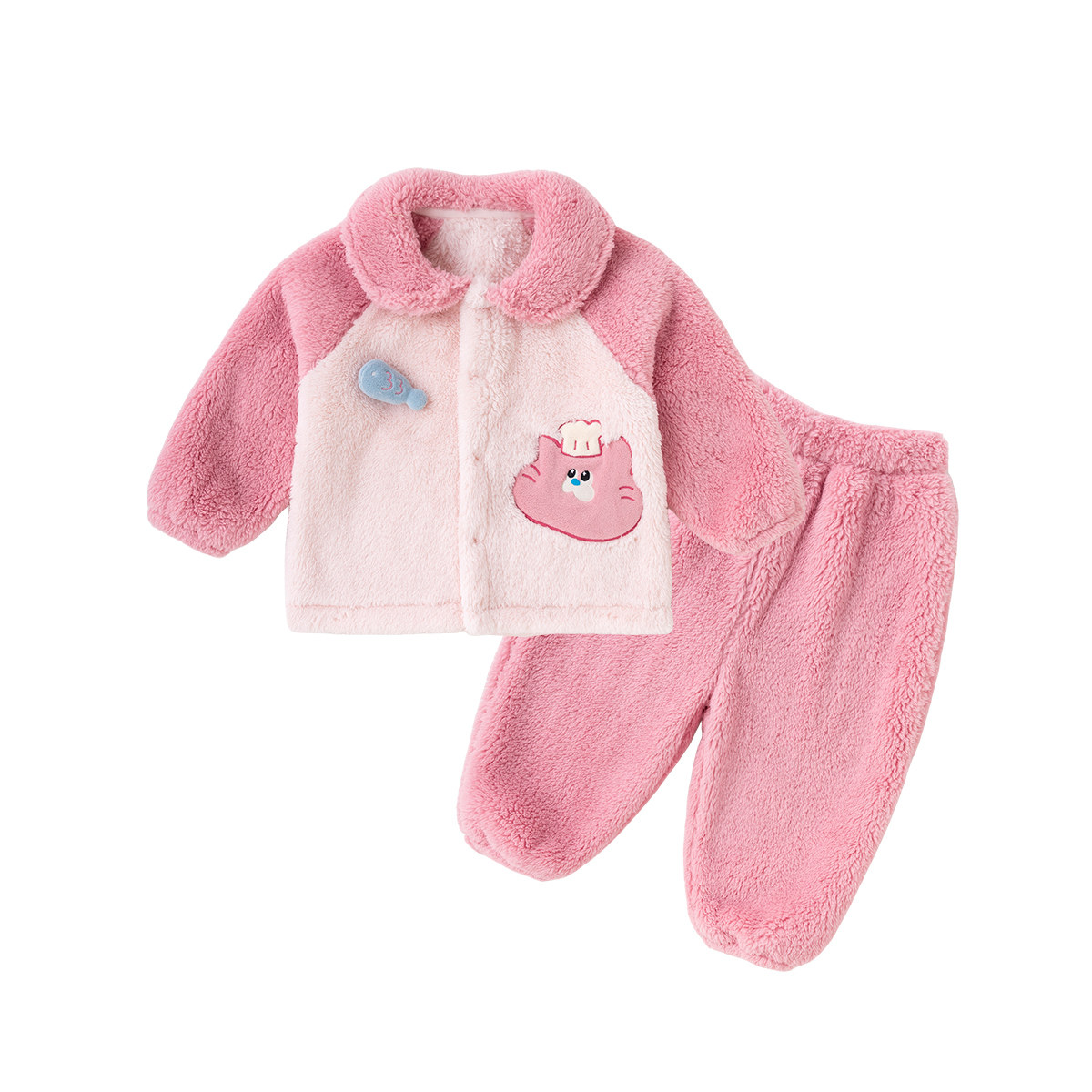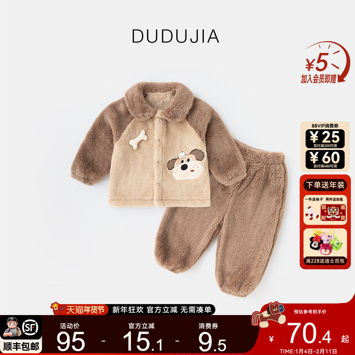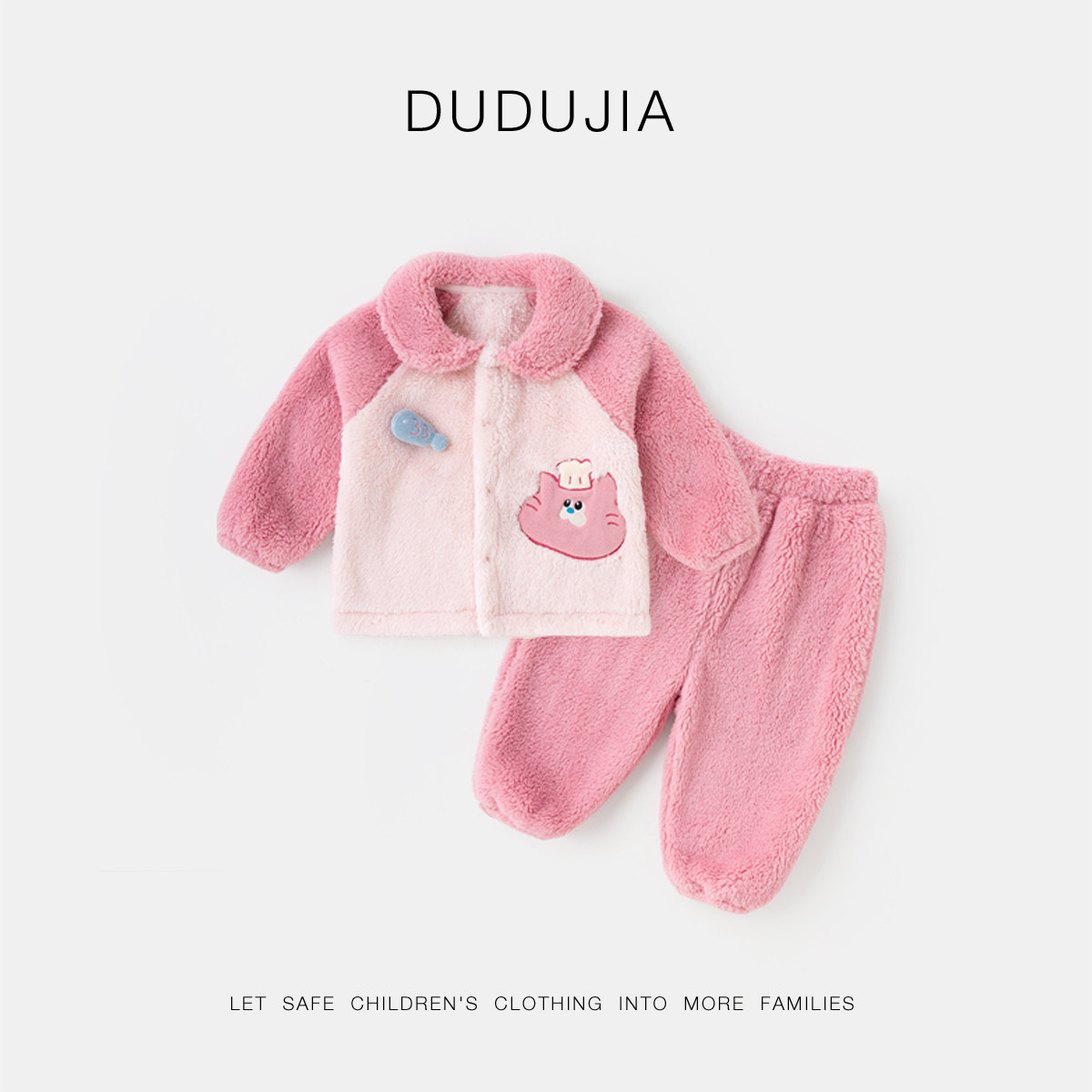 小黑托昵男女童连帽睡衣套装半边绒儿童家居服冬款加绒加厚空调服