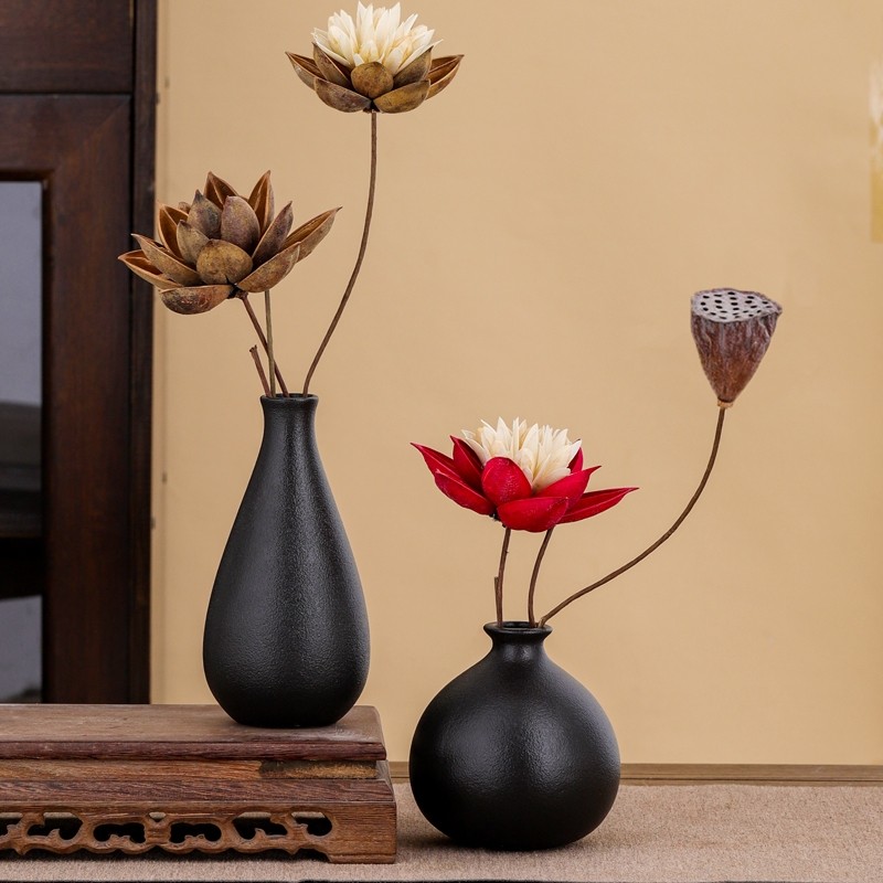 新中式陶瓷花瓶装饰品摆件客厅插花黑陶古风茶几干花花束禅意复古