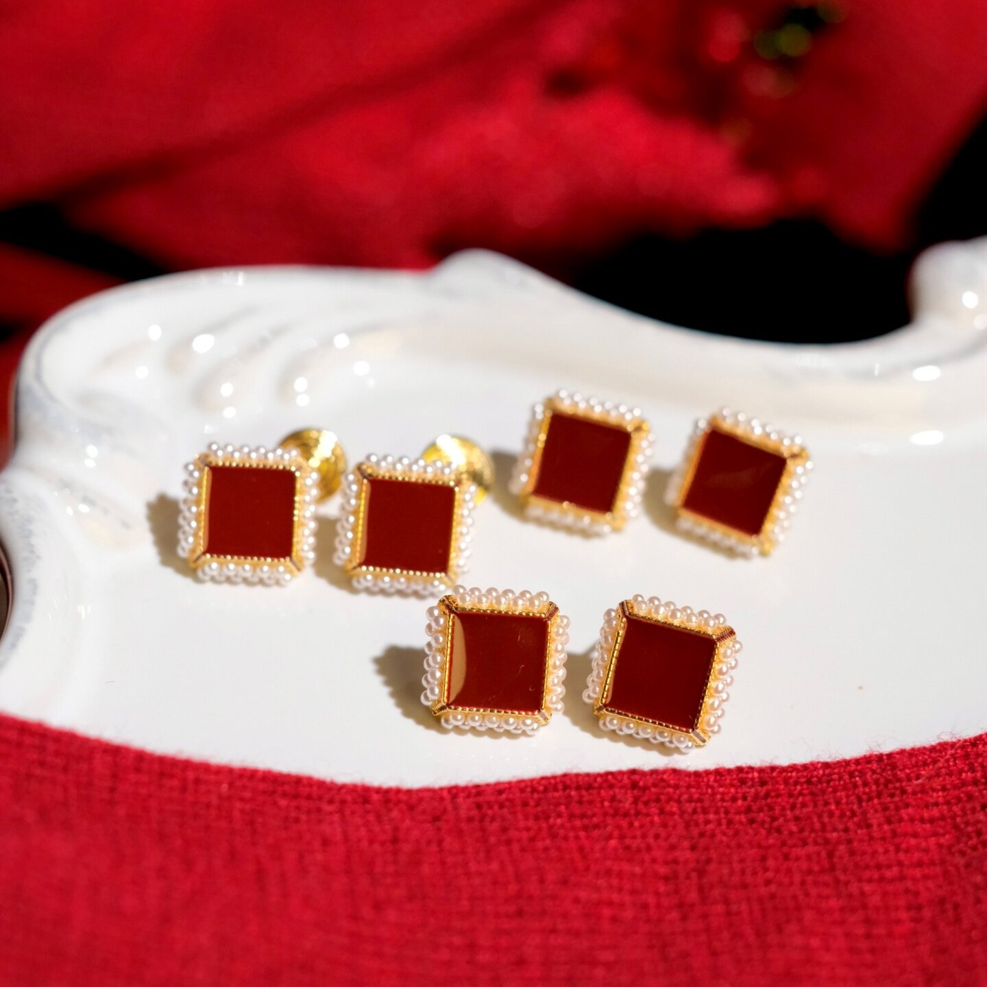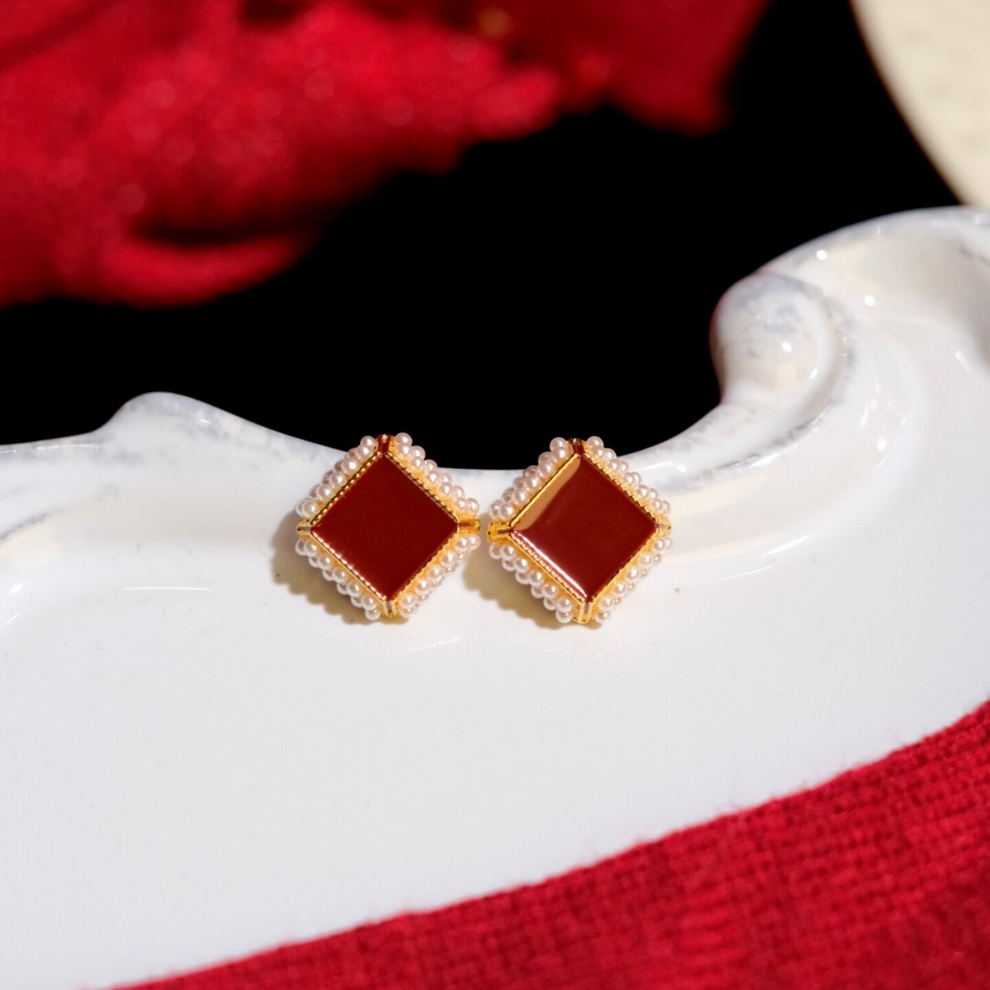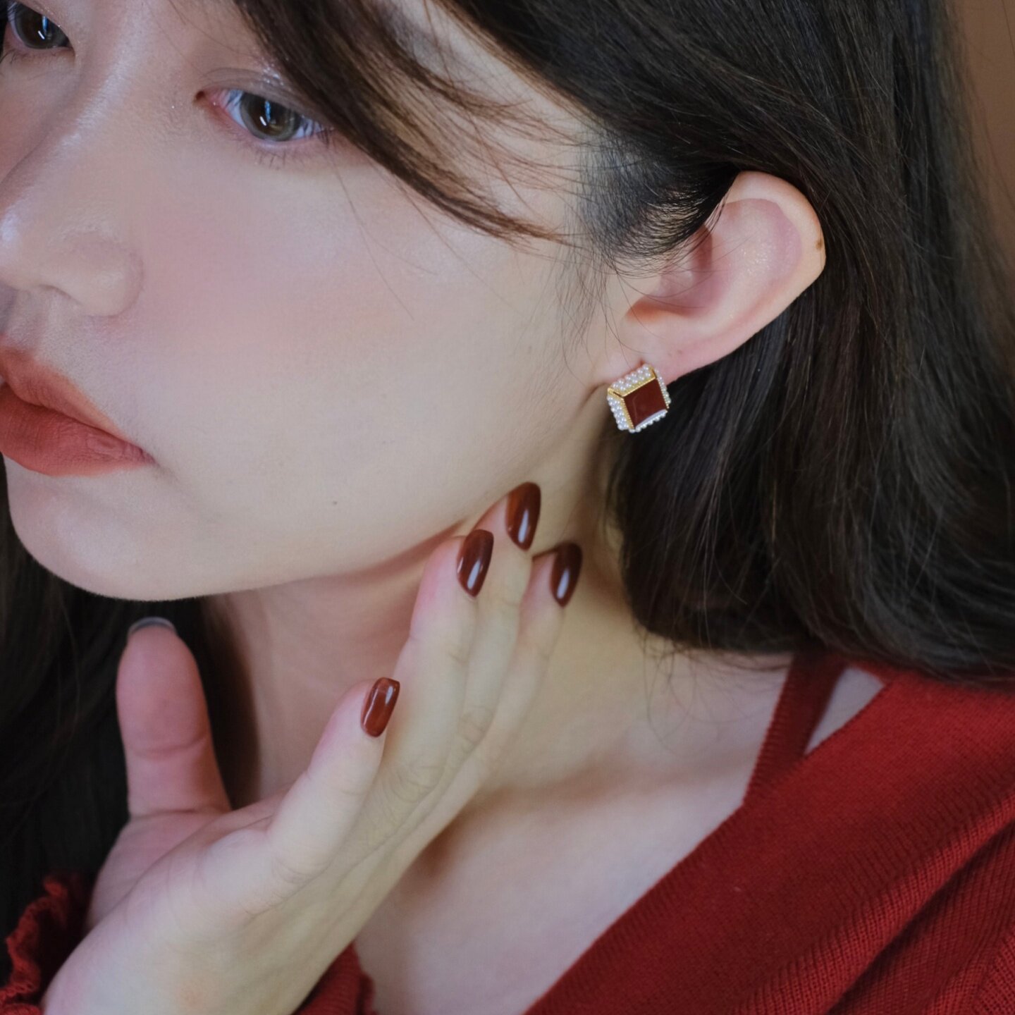 《奥罗拉》复古优雅小巧酒红色几何方形珍珠显白耳钉耳环耳夹耳饰