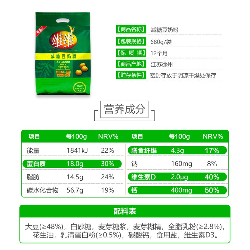 维维减糖豆奶粉680g非转基因冲饮早餐袋装豆浆小包装冲泡高钙优选