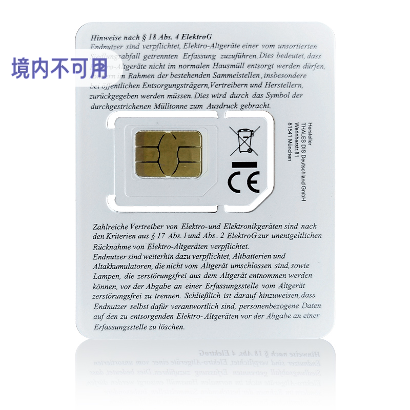 欧洲德国进口原生卡 可选40GB大流量 可选含通话 赠送转换插头/取卡针