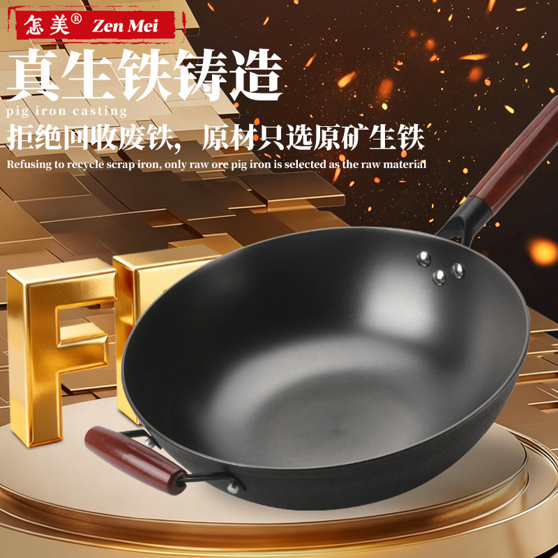 纯生铁无涂层免开锅炒菜锅家用铸铁不粘平底炒锅陆川电磁炉燃气灶