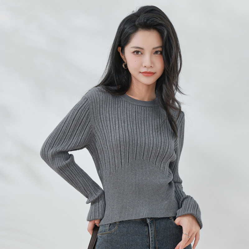 三福长袖上衣2025新款秋季圆领修身针织衫简约纯色内搭打底衫女装