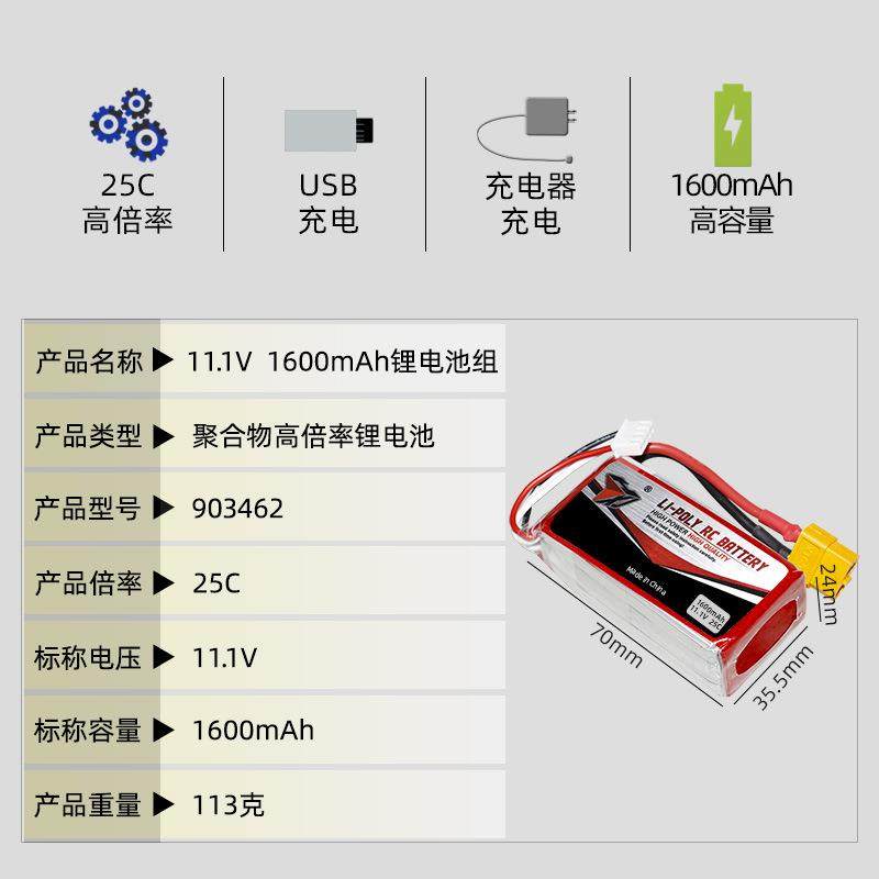 11.1V 1600mAh车模锂电池 25C高倍率 903462飞行器无人机航模电池