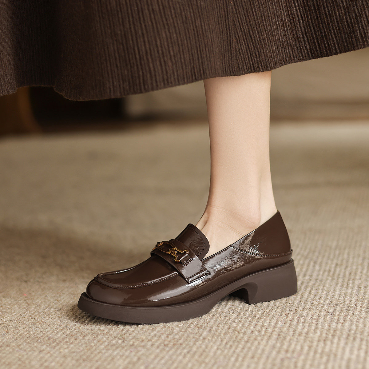 羊皮~棕色山茶花乐福鞋女2025新款通勤粗跟单鞋百搭英伦风小皮鞋