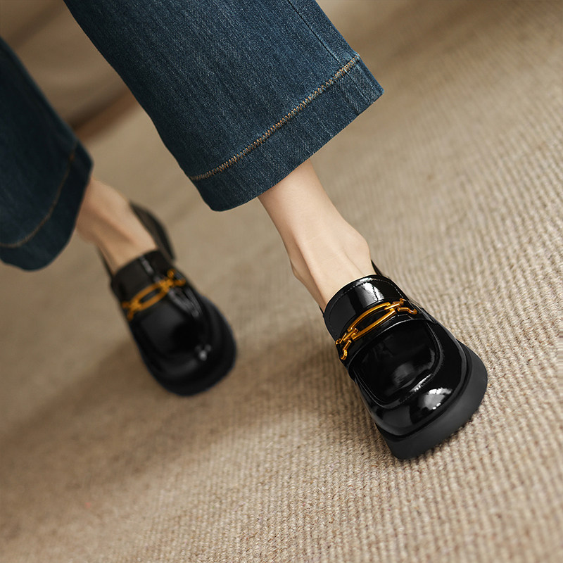 真皮~骄屿复古一脚蹬乐福鞋女厚底粗跟圆头单鞋百搭英伦风小皮鞋