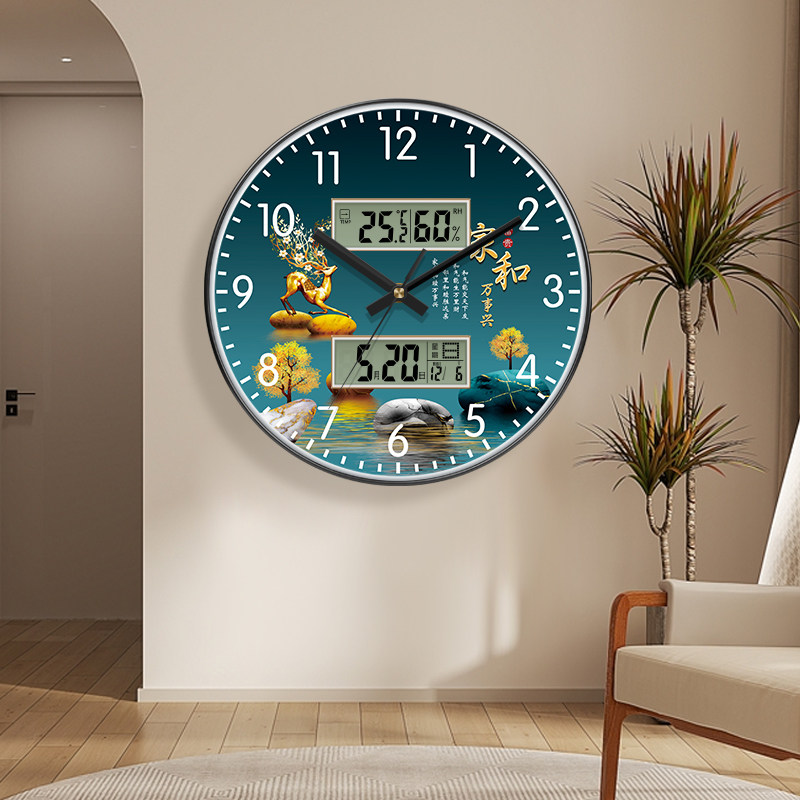 静音挂钟挂墙中国风客厅家和麋鹿时钟自动对时挂表家用日历石英钟