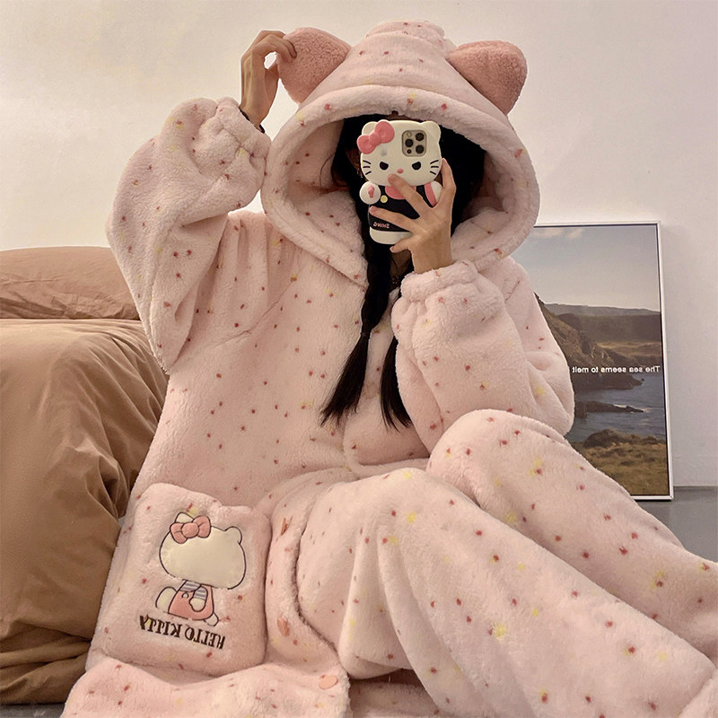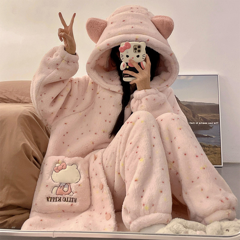 秋冬季连帽珊瑚绒睡袍女2025新款加厚毛绒可爱睡衣女款家居服套装