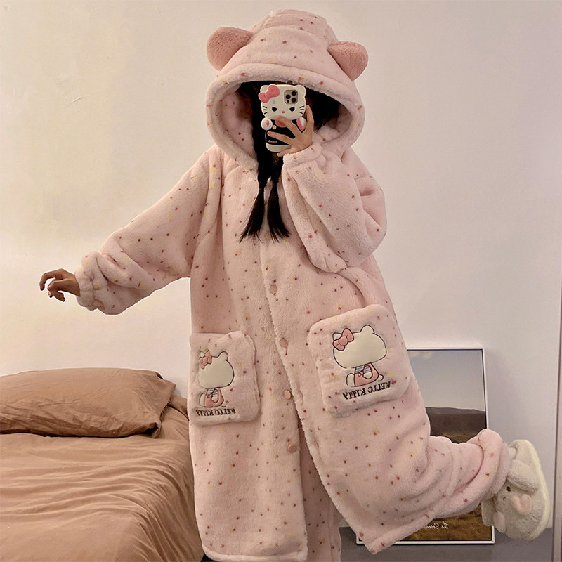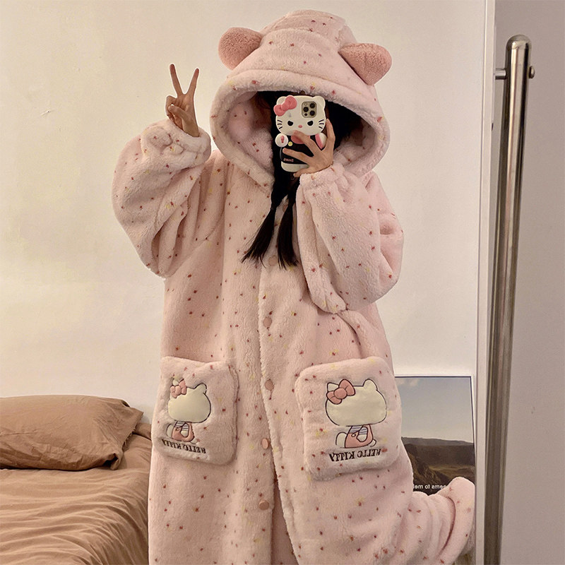yso【酷猫系列】睡衣女秋冬新款毛绒长款连帽加厚保暖开衫睡袍D