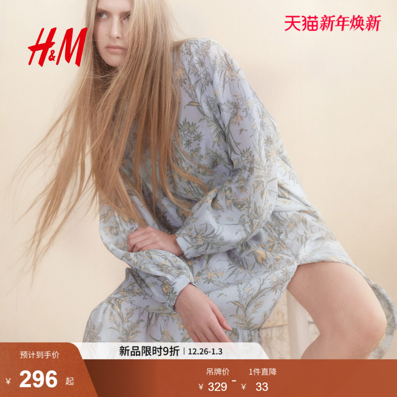 HM女装连衣裙2025冬季花朵系带灯笼袖皱感A字植物印花长裙1219083